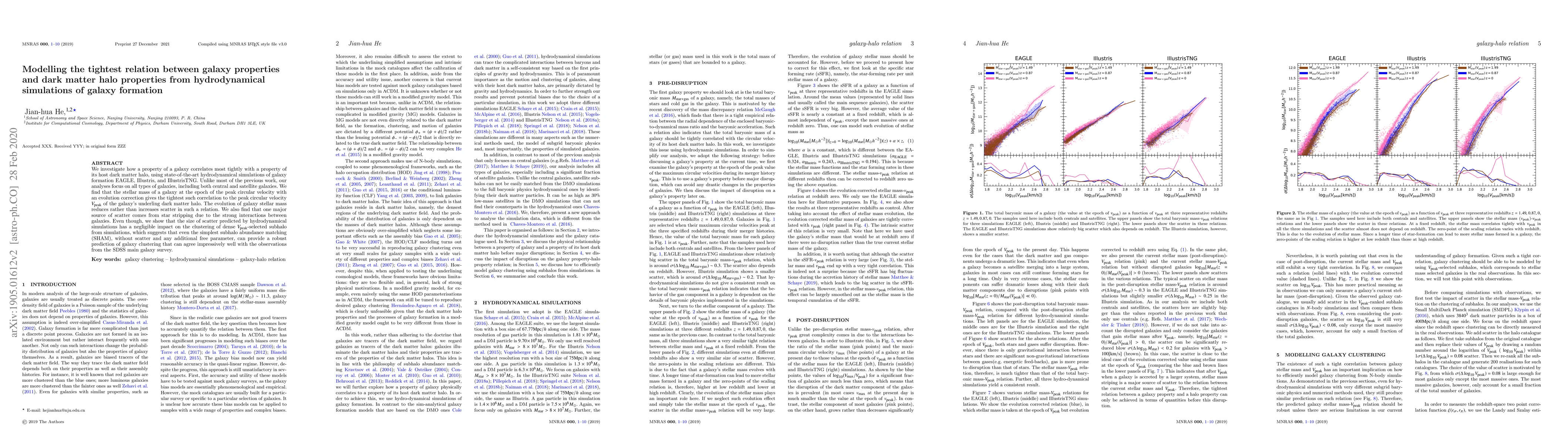 We investigate how a property of a galaxy correlates most tightly with a property of its host dark matter halo, using state-of-the-art hydrodynamical simulations of galaxy formation EAGLE, Illustris, and IllustrisTNG. Unlike most of the previous work, our analyses focus on all types of galaxies, including both central and satellite galaxies. We find that the stellar mass of a galaxy at the epoch of the peak circular velocity with an evolution correction gives the tightest such correlation to the peak circular velocity $V_{\rm peak}$ of the galaxy's underling dark matter halo. The evolution of galaxy stellar mass reduces rather than increases scatter in such a relation. We also find that one major source of scatter comes from star stripping due to the strong interactions between galaxies. Even though, we show that the size of scatter predicted by hydrodynamical simulations has a negligible impact on the clustering of dense $V_{\rm peak}$-selected subhalo from simulations, which suggests that even the simplest subhalo abundance matching (SHAM), without scatter and any additional free parameter, can provide a robust prediction of galaxy clustering that can agree impressively well with the observations from the SDSS main galaxy survey.