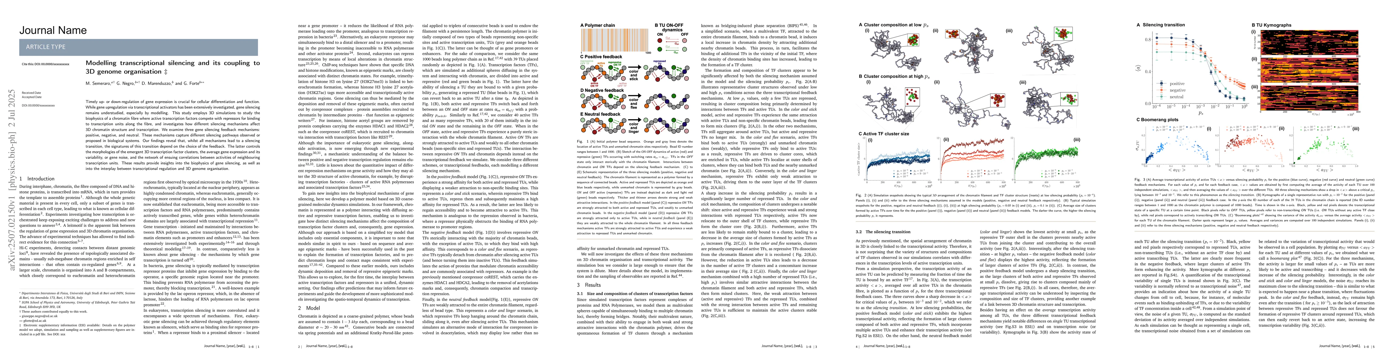 Timely up- or down-regulation of gene expression is crucial for cellular differentiation and function. While gene upregulation via transcriptional activators has been extensively investigated, gene silencing remains understudied, especially by modelling. This study employs 3D simulations to study the biophysics of a chromatin fibre where active transcription factors compete with repressors for binding to transcription units along the fibre, and investigates how different silencing mechanisms affect 3D chromatin structure and transcription. We examine three gene silencing feedback mechanisms: positive, negative, and neutral. These mechanisms capture different silencing pathways observed or proposed in biological systems. Our findings reveal that, whilst all mechanisms lead to a silencing transition, the signatures of this transition depend on the choice of the feedback. The latter controls the morphologies of the emergent 3D transcription factor clusters, the average gene expression and its variability, or gene noise, and the network of ensuing correlations between activities of neighbouring transcription units. These results provide insights into the biophysics of gene silencing, as well as into the interplay between transcriptional regulation and 3D genome organisation.