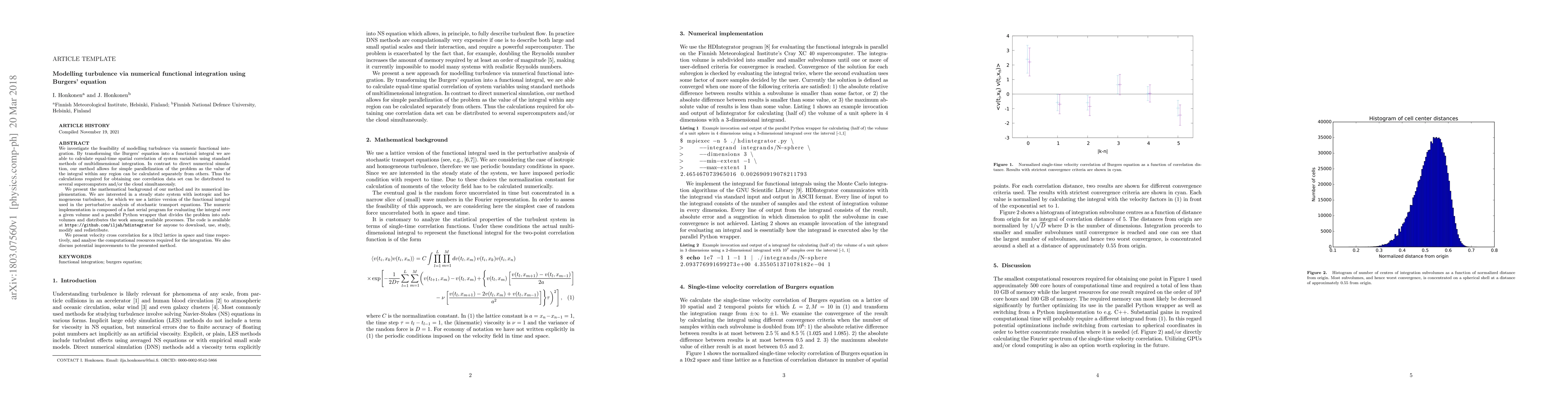 This paper explores a novel method for modelling turbulence using numerical functional integration based on Burgers' equation, enabling the calculation of spatial correlations via multidimensional integration. The method allows for parallel computation, distributing the workload across multiple processors, and is demonstrated with a lattice version of the functional integral.