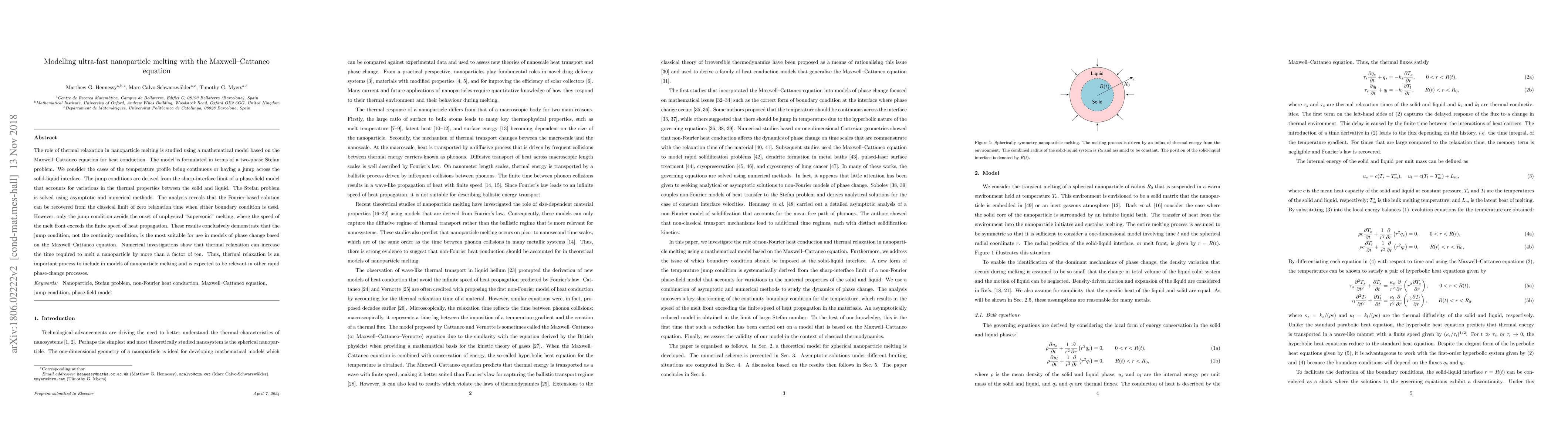 This paper models ultra-fast nanoparticle melting using the Maxwell-Cattaneo equation for heat conduction, revealing that thermal relaxation significantly impacts melting time. The jump condition across the solid-liquid interface, derived from a phase-field model, prevents unphysical "supersonic" melting, underscoring its suitability for phase change models.