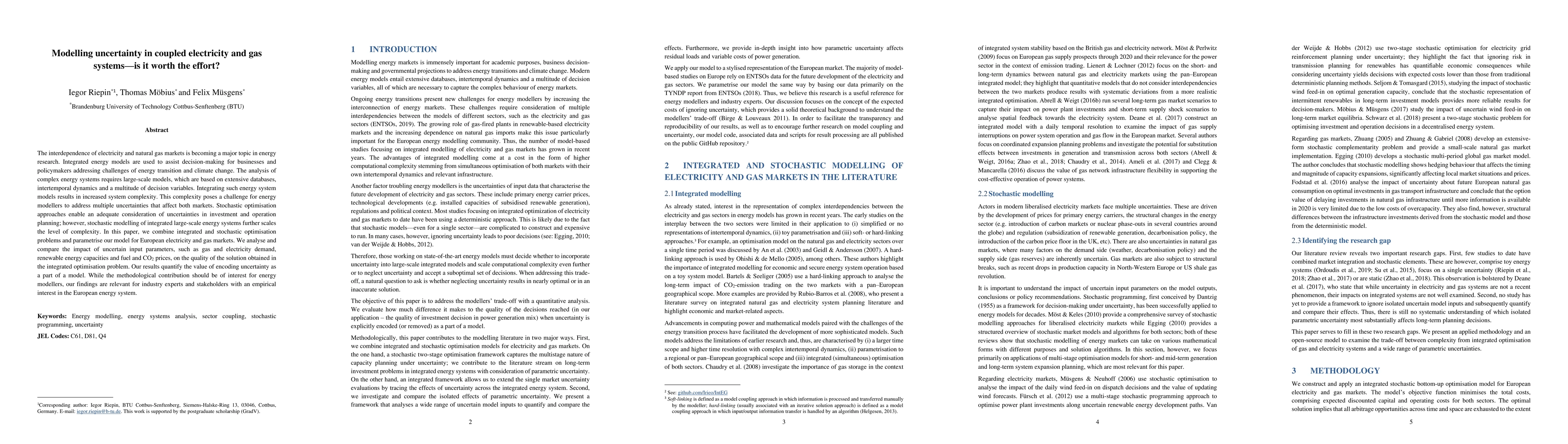 The interdependence of electricity and natural gas markets is becoming a major topic in energy research. Integrated energy models are used to assist decision-making for businesses and policymakers addressing challenges of energy transition and climate change. The analysis of complex energy systems requires large-scale models, which are based on extensive databases, intertemporal dynamics and a multitude of decision variables. Integrating such energy system models results in increased system complexity. This complexity poses a challenge for energy modellers to address multiple uncertainties that affect both markets. Stochastic optimisation approaches enable an adequate consideration of uncertainties in investment and operation planning; however, stochastic modelling of integrated large-scale energy systems further scales the level of complexity. In this paper, we combine integrated and stochastic optimisation problems and parametrise our model for European electricity and gas markets. We analyse and compare the impact of uncertain input parameters, such as gas and electricity demand, renewable energy capacities and fuel and CO2 prices, on the quality of the solution obtained in the integrated optimisation problem. Our results quantify the value of encoding uncertainty as a part of a model. While the methodological contribution should be of interest for energy modellers, our findings are relevant for industry experts and stakeholders with an empirical interest in the European energy system.