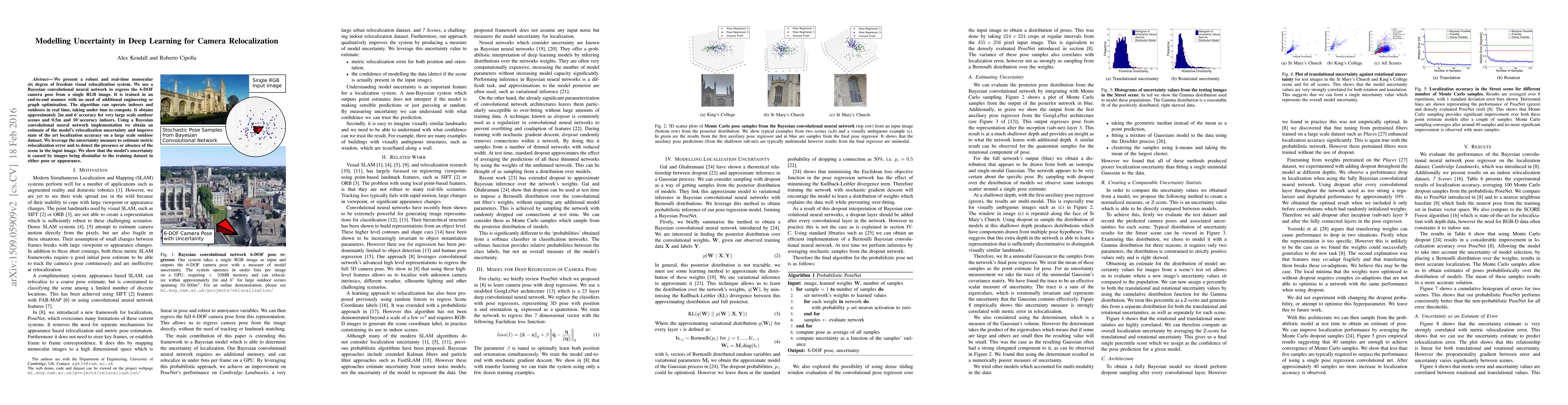 This paper introduces a real-time monocular visual relocalization system using a Bayesian convolutional neural network to estimate 6-DOF camera pose from single RGB images, achieving high accuracy both indoors and outdoors. The model's uncertainty is leveraged to improve localization accuracy and detect scene presence, with errors primarily due to dissimilarities in training data.