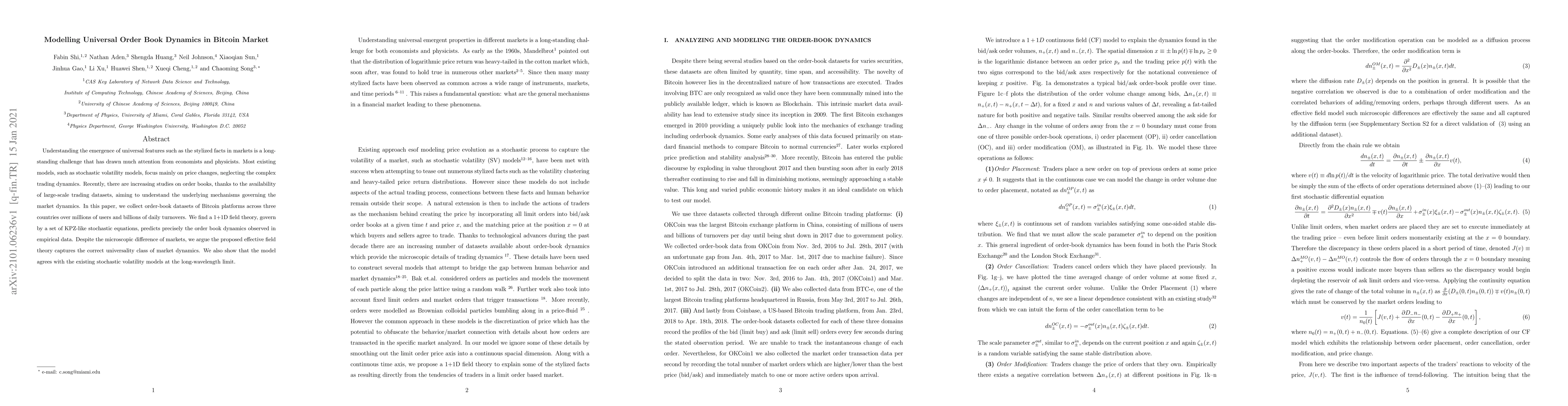 Understanding the emergence of universal features such as the stylized facts in markets is a long-standing challenge that has drawn much attention from economists and physicists. Most existing models, such as stochastic volatility models, focus mainly on price changes, neglecting the complex trading dynamics. Recently, there are increasing studies on order books, thanks to the availability of large-scale trading datasets, aiming to understand the underlying mechanisms governing the market dynamics. In this paper, we collect order-book datasets of Bitcoin platforms across three countries over millions of users and billions of daily turnovers. We find a 1+1D field theory, govern by a set of KPZ-like stochastic equations, predicts precisely the order book dynamics observed in empirical data. Despite the microscopic difference of markets, we argue the proposed effective field theory captures the correct universality class of market dynamics. We also show that the model agrees with the existing stochastic volatility models at the long-wavelength limit.