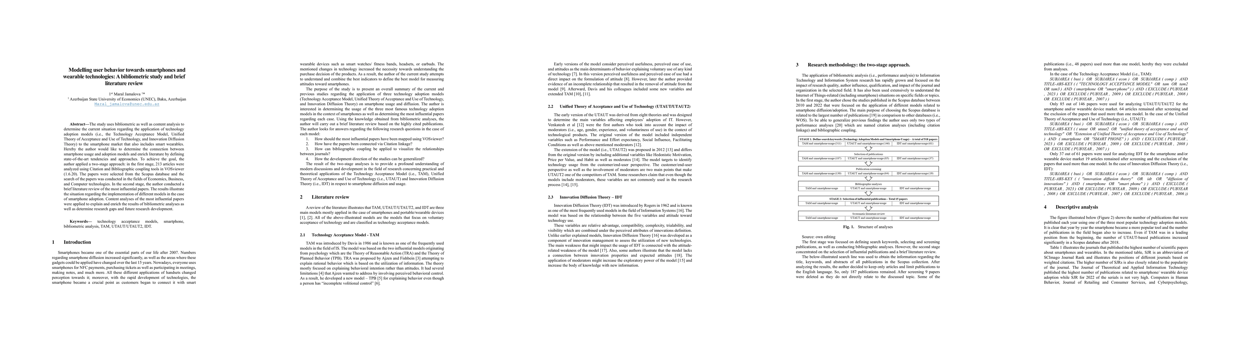 This study employs bibliometric and content analysis to explore the application of technology adoption models to smartphones and wearables, revealing current trends and research gaps. Findings highlight the use of models like the Technology Acceptance Model and their integration in the smartphone market, with a focus on influential papers to inform future research directions.
