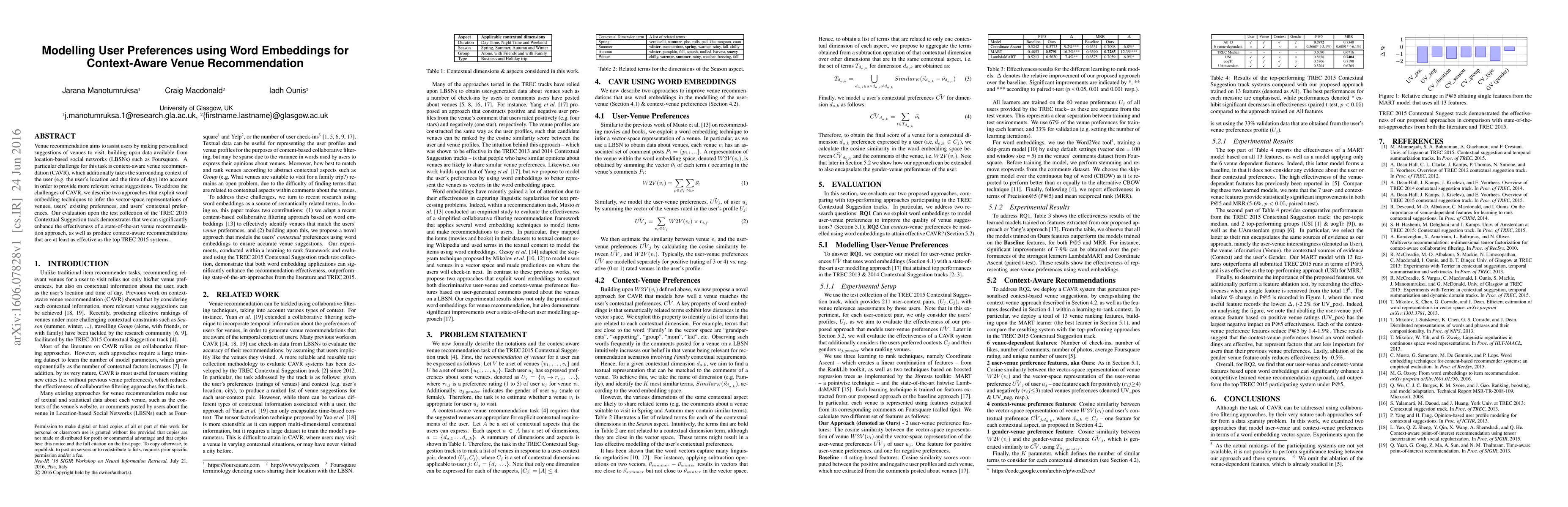 This paper proposes two methods using word embeddings to model user preferences for context-aware venue recommendations, significantly improving over state-of-the-art techniques and achieving results comparable to the top systems in the TREC 2015 Contextual Suggestion track.