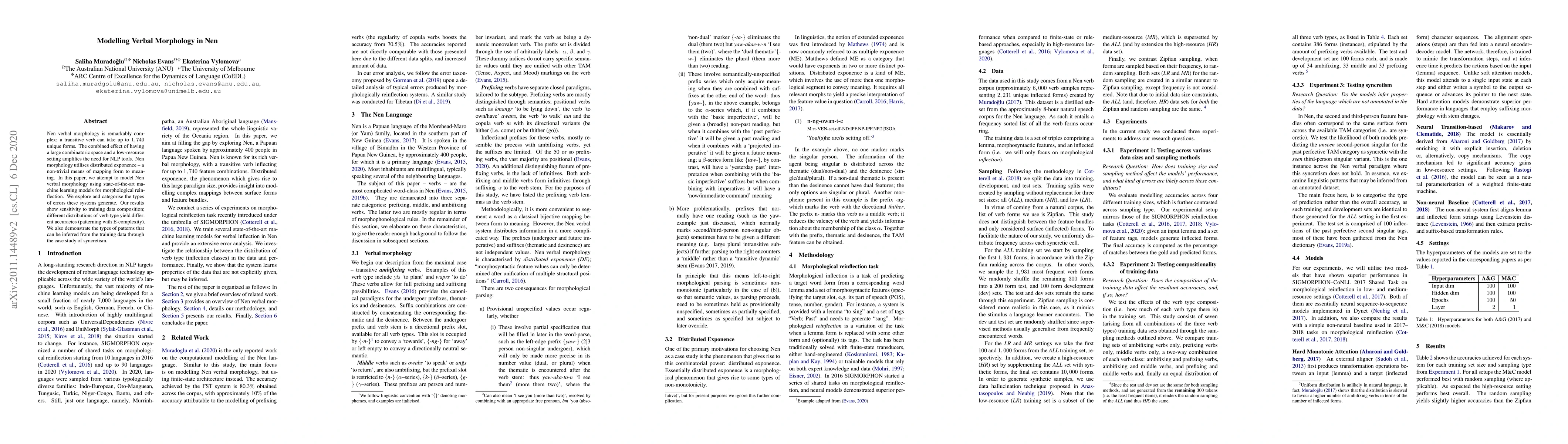 Nen verbal morphology is remarkably complex; a transitive verb can take up to 1,740 unique forms. The combined effect of having a large combinatoric space and a low-resource setting amplifies the need for NLP tools. Nen morphology utilises distributed exponence - a non-trivial means of mapping form to meaning. In this paper, we attempt to model Nen verbal morphology using state-of-the-art machine learning models for morphological reinflection. We explore and categorise the types of errors these systems generate. Our results show sensitivity to training data composition; different distributions of verb type yield different accuracies (patterning with E-complexity). We also demonstrate the types of patterns that can be inferred from the training data through the case study of syncretism.