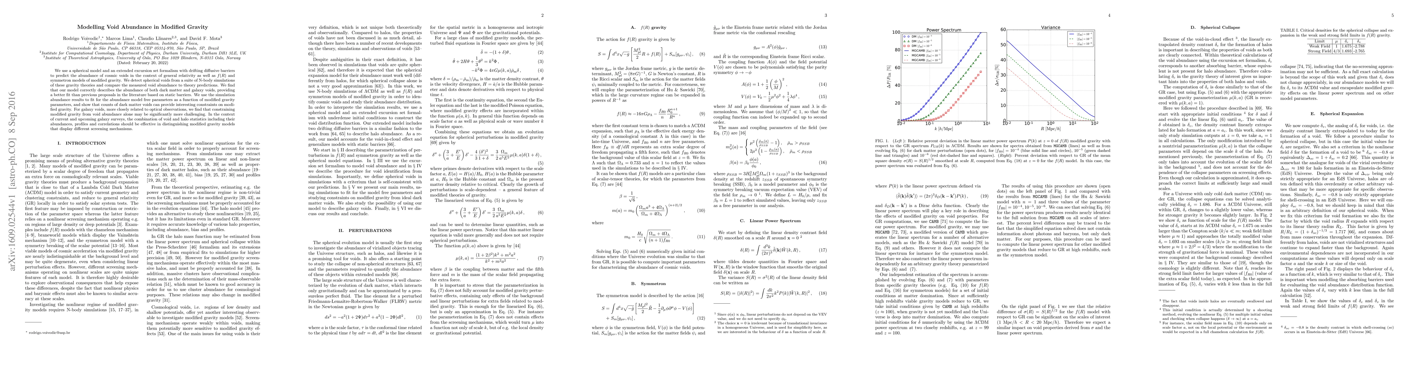 The research uses N-body simulations from the Isis code for GR and modified gravity models to define spherical voids detected by ZOBOV, a void finder based on Voronoi tessellation. The void abundance results are interpreted through a spherical expansion model and an extended excursion set approach.