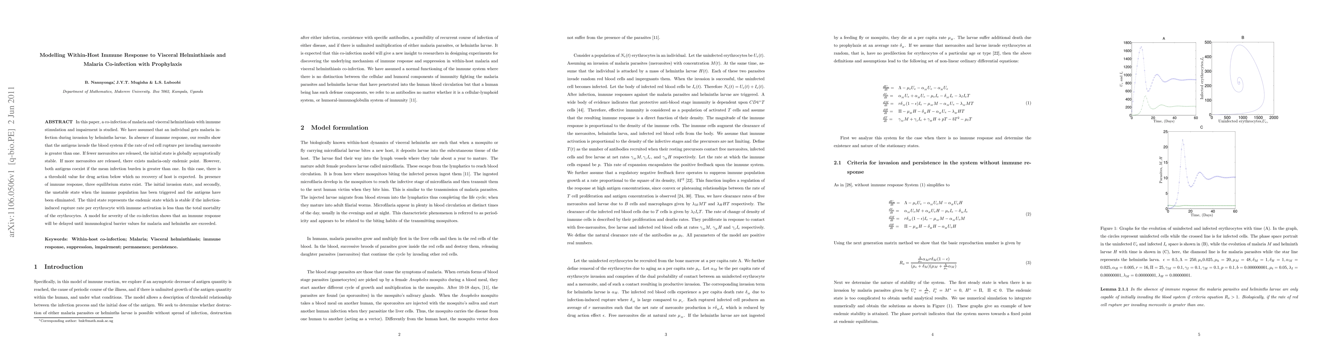 This paper models the within-host immune response to co-infection by malaria and visceral helminthiasis, showing that antigen coexistence depends on infection burden and merozoite release rates. With prophylaxis, three equilibrium states are identified: initial invasion, transient immune response, and stable endemic state, contingent upon infection dynamics and immune activation thresholds.