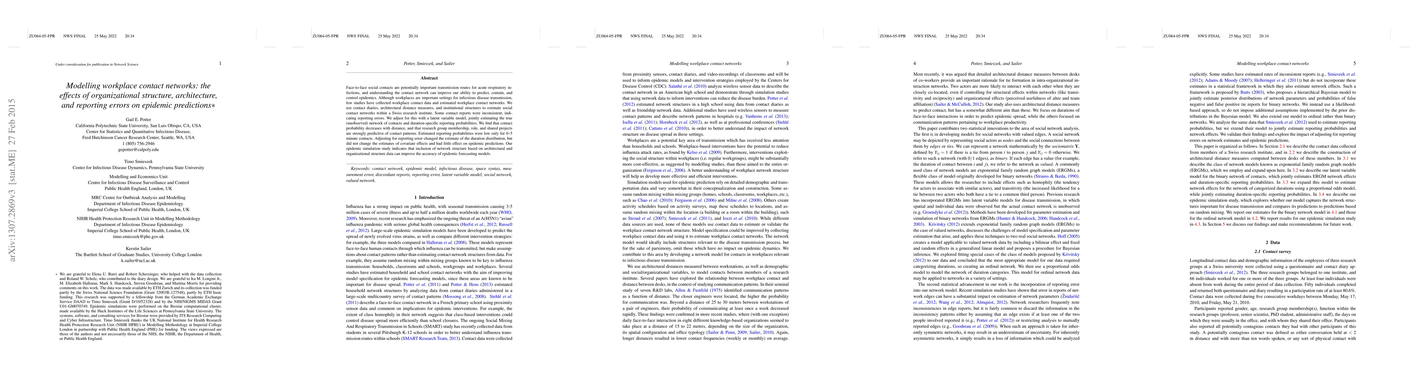 A study models workplace contact networks to predict epidemic risks, finding that architectural and organizational structure can improve forecasting accuracy. Contact patterns vary with distance, role, and shared projects.