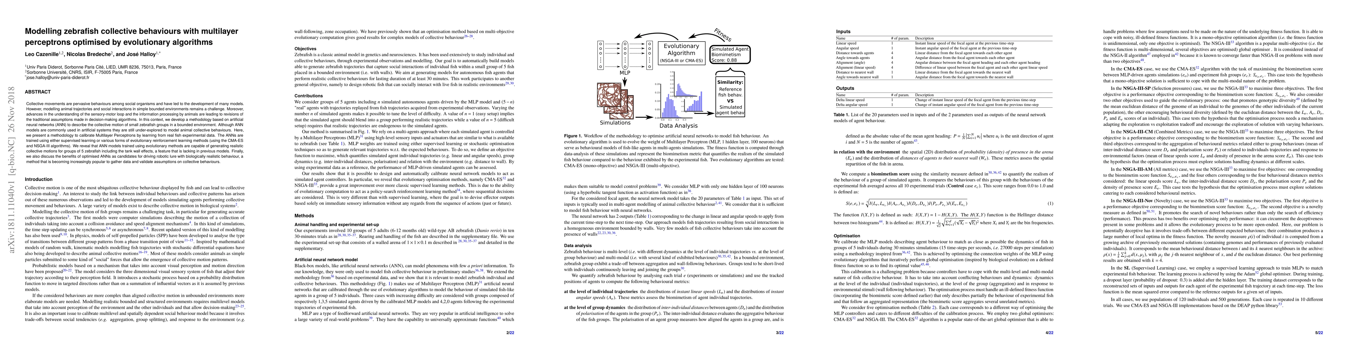 This paper develops a methodology using multilayer perceptrons (MLPs) optimized by evolutionary algorithms to model the collective behaviours of zebrafish in a bounded environment. The study finds that MLPs trained with evolutionary reinforcement learning generate realistic collective motions, including tank wall effects, surpassing previous models.