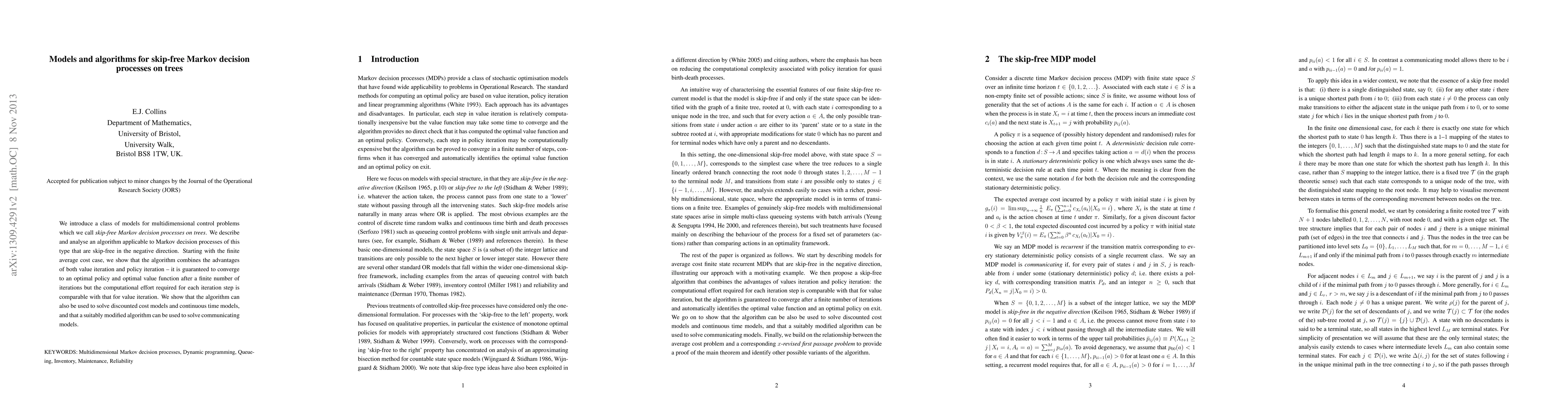 This paper introduces a new class of skip-free Markov decision processes on trees for multidimensional control problems and presents an algorithm that combines the benefits of value iteration and policy iteration. The algorithm is shown to converge to optimal policies and value functions efficiently, applicable to finite, discounted, and continuous time models.