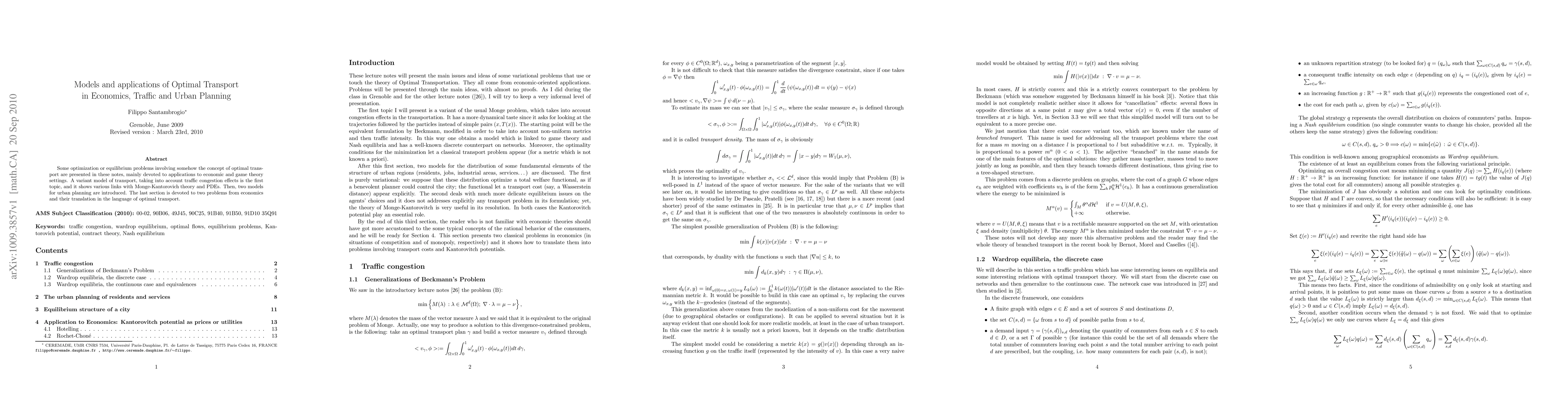 Summary: This paper explores optimal transport models and their applications in economics, traffic, and urban planning, focusing on congestion effects and connections to Monge-Kantorovich theory. It also introduces two urban planning models and discusses economic problems translated into optimal transport frameworks.