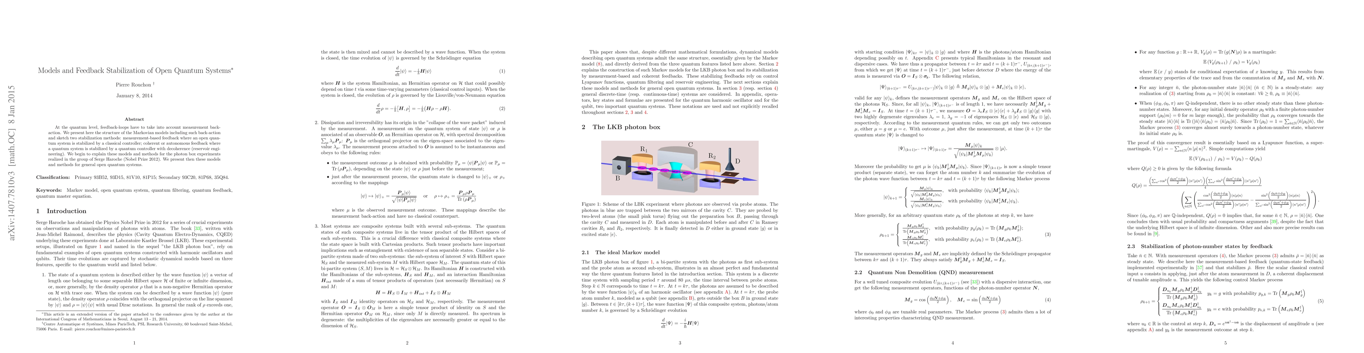 At the quantum level, feedback-loops have to take into account measurement back-action. We present here the structure of the Markovian models including such back-action and sketch two stabilization methods: measurement-based feedback where an open quantum system is stabilized by a classical controller; coherent or autonomous feedback where a quantum system is stabilized by a quantum controller with decoherence (reservoir engineering). We begin to explain these models and methods for the photon box experiments realized in the group of Serge Haroche (Nobel Prize 2012). We present then these models and methods for general open quantum systems.