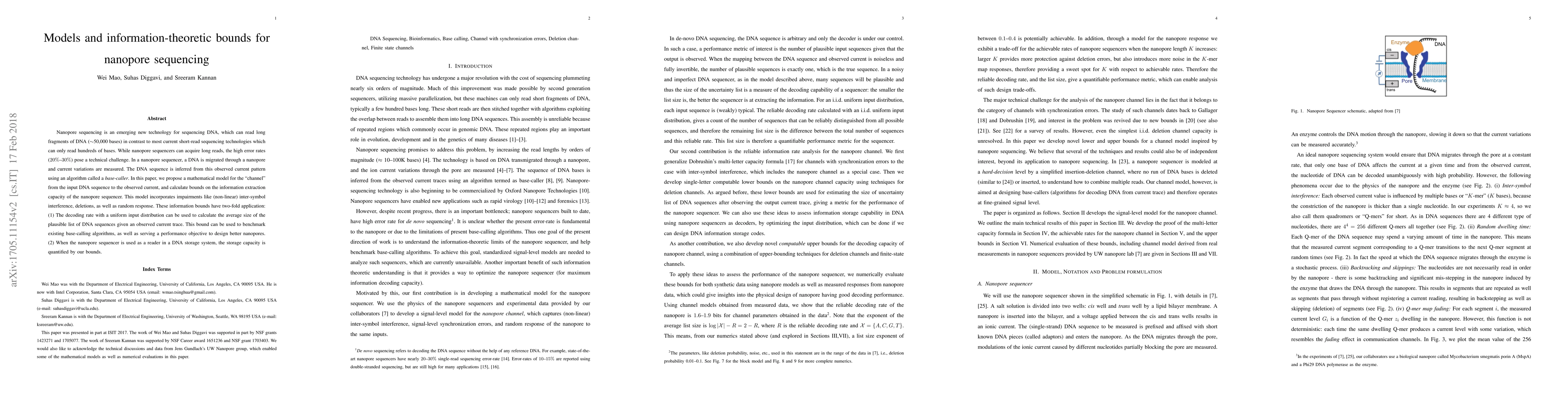 This paper proposes a mathematical model for nanopore sequencing, detailing the channel's information extraction capacity and accounting for errors like inter-symbol interference. The derived information bounds are used to benchmark base-calling algorithms and quantify the storage capacity when nanopores are used in DNA storage systems.