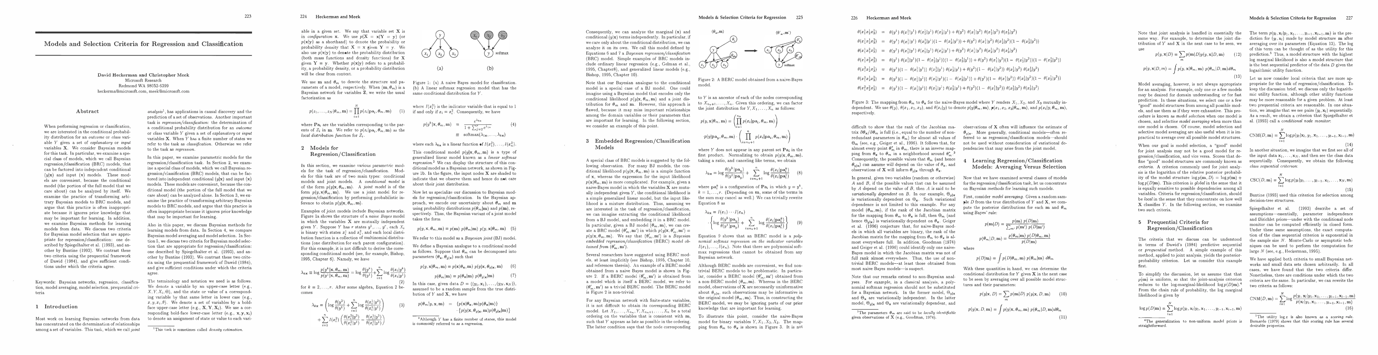 When performing regression or classification, we are interested in the conditional probability distribution for an outcome or class variable Y given a set of explanatoryor input variables X. We consider Bayesian models for this task. In particular, we examine a special class of models, which we call Bayesian regression/classification (BRC) models, that can be factored into independent conditional (y|x) and input (x) models. These models are convenient, because the conditional model (the portion of the full model that we care about) can be analyzed by itself. We examine the practice of transforming arbitrary Bayesian models to BRC models, and argue that this practice is often inappropriate because it ignores prior knowledge that may be important for learning. In addition, we examine Bayesian methods for learning models from data. We discuss two criteria for Bayesian model selection that are appropriate for repression/classification: one described by Spiegelhalter et al. (1993), and another by Buntine (1993). We contrast these two criteria using the prequential framework of Dawid (1984), and give sufficient conditions under which the criteria agree.