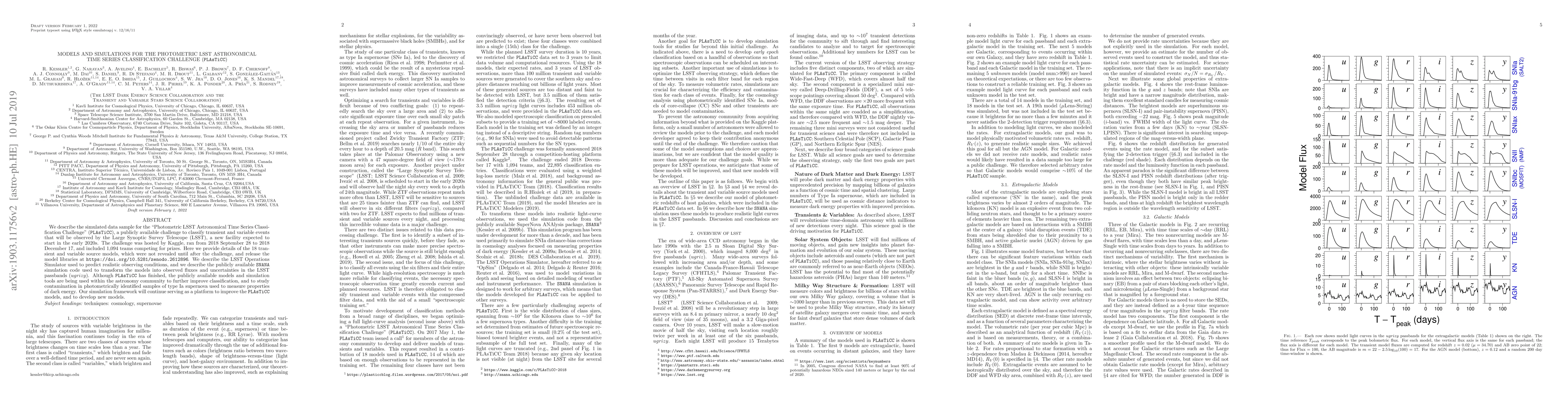 This paper details the simulated data sample for the PLAsTiCC challenge, which aimed to classify transient and variable events from the upcoming LSST telescope. It describes the 18 source models and the LSST Operations Simulator used to create realistic observing conditions, and provides tools for further astronomical research.