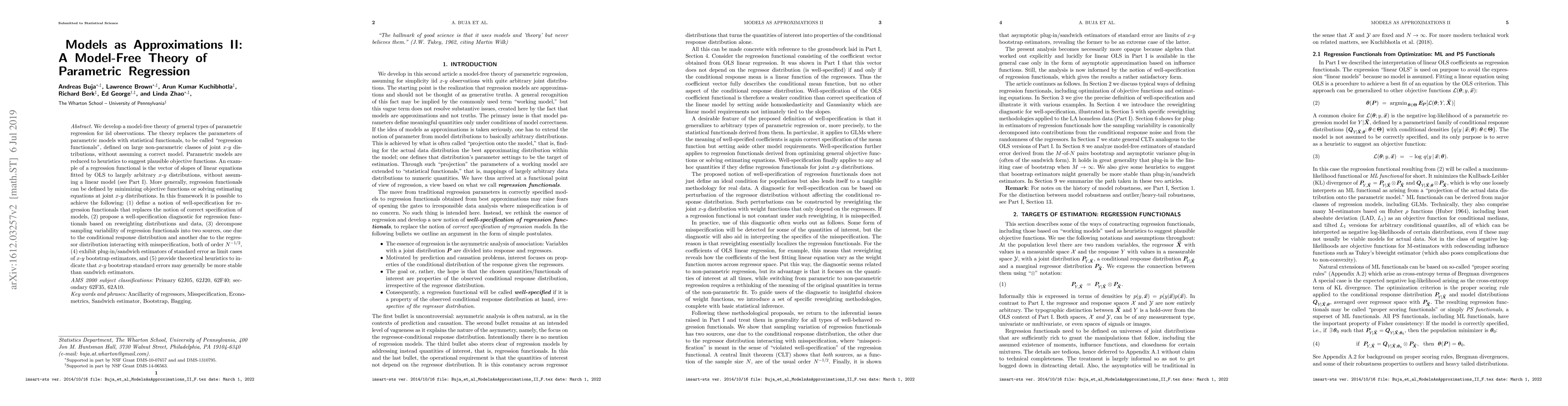 We develop a model-free theory of general types of parametric regression for iid observations. The theory replaces the parameters of parametric models with statistical functionals, to be called "regression functionals'', defined on large non-parametric classes of joint $\xy$ distributions, without assuming a correct model. Parametric models are reduced to heuristics to suggest plausible objective functions. An example of a regression functional is the vector of slopes of linear equations fitted by OLS to largely arbitrary $\xy$ distributions, without assuming a linear model (see Part~I). More generally, regression functionals can be defined by minimizing objective functions or solving estimating equations at joint $\xy$ distributions. In this framework it is possible to achieve the following: (1)~define a notion of well-specification for regression functionals that replaces the notion of correct specification of models, (2)~propose a well-specification diagnostic for regression functionals based on reweighting distributions and data, (3)~decompose sampling variability of regression functionals into two sources, one due to the conditional response distribution and another due to the regressor distribution interacting with misspecification, both of order $N^{-1/2}$, (4)~exhibit plug-in/sandwich estimators of standard error as limit cases of $\xy$ bootstrap estimators, and (5)~provide theoretical heuristics to indicate that $\xy$ bootstrap standard errors may generally be more stable than sandwich estimators.