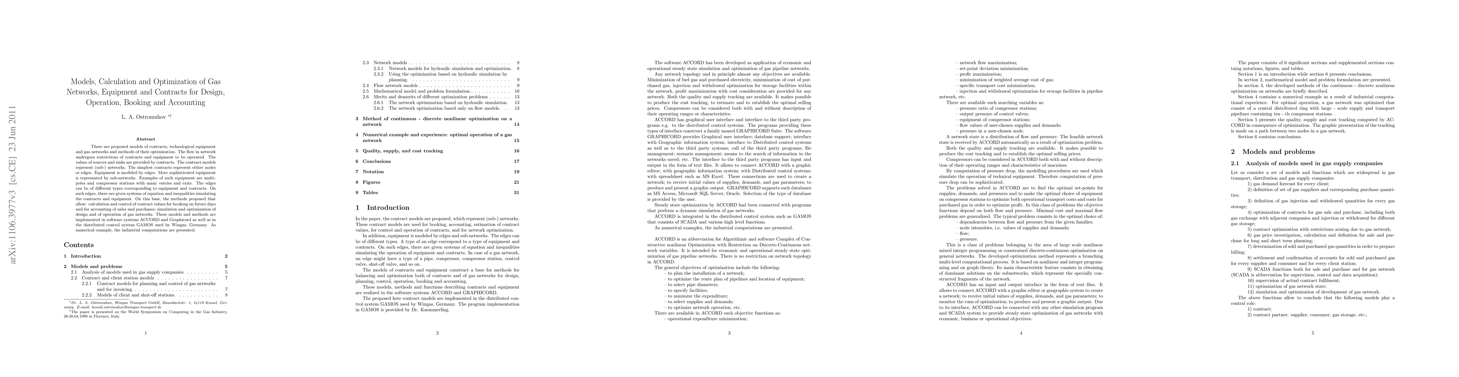 There are proposed models of contracts, technological equipment and gas networks and methods of their optimization. The flow in network undergoes restrictions of contracts and equipment to be operated. The values of sources and sinks are provided by contracts. The contract models represent (sub-) networks. The simplest contracts represent either nodes or edges. Equipment is modeled by edges. More sophisticated equipment is represented by sub-networks. Examples of such equipment are multi-poles and compressor stations with many entries and exits. The edges can be of different types corresponding to equipment and contracts. On such edges, there are given systems of equation and inequalities simulating the contracts and equipment. On this base, the methods proposed that allow: calculation and control of contract values for booking on future days and for accounting of sales and purchases; simulation and optimization of design and of operation of gas networks. These models and methods are implemented in software systems ACCORD and Graphicord as well as in the distributed control system used by Wingas, Germany. As numerical example, the industrial computations are presented.