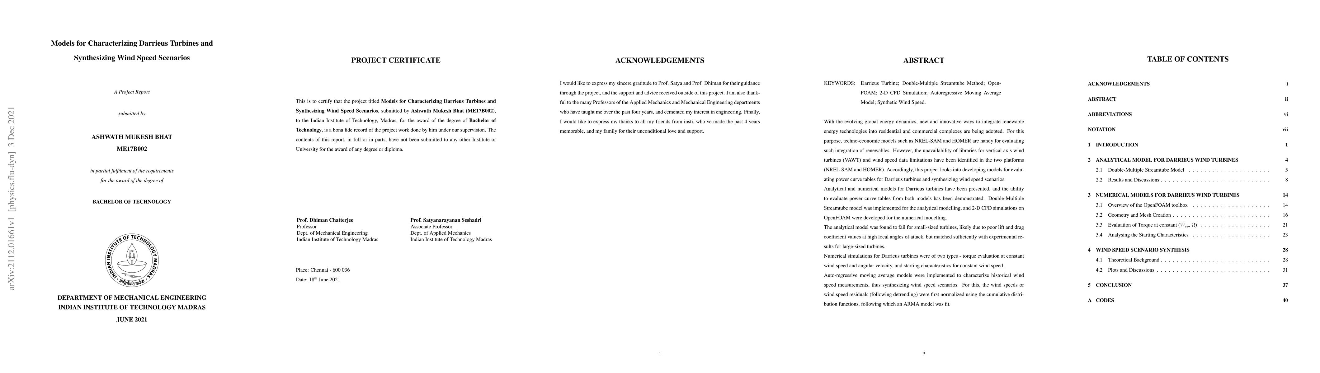 The development and validation of both analytical Double-Multiple Streamtube models and CFD simulations for Darrieus VAWTs, along with methods for generating synthetic wind speed scenarios using ARMA models.