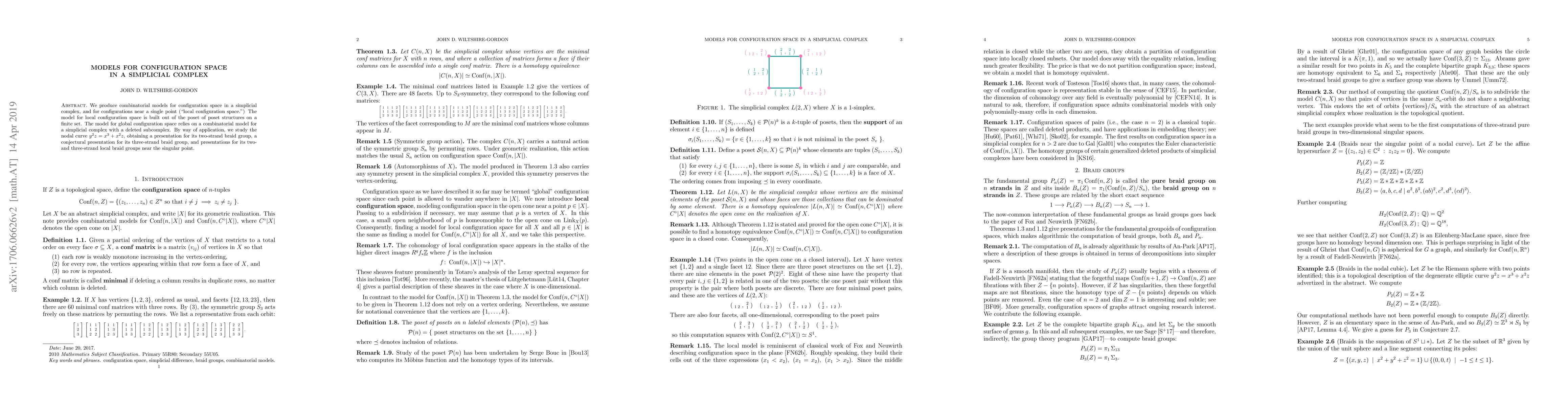 We produce combinatorial models for configuration space in a simplicial complex, and for configurations near a single point ("local configuration space.") The model for local configuration space is built out of the poset of poset structures on a finite set. The model for global configuration space relies on a combinatorial model for a simplicial complex with a deleted subcomplex. By way of application, we study the nodal curve $y^2 z = x^3 + x^2 z$, obtaining a presentation for its two-strand braid group, a conjectural presentation for its three-strand braid group, and presentations for its two- and three-strand local braid groups near the singular point.