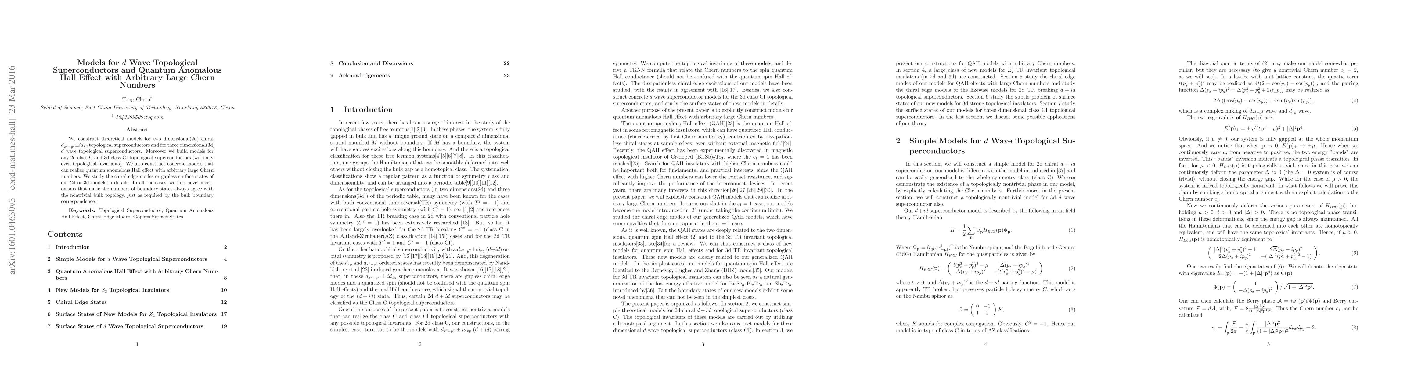 The paper constructs theoretical models for 2D chiral $d_{x^2-y^2}\pm id_{xy}$ and 3D $d$ wave topological superconductors, realizing quantum anomalous Hall effects with large Chern numbers, and validates the bulk-boundary correspondence through detailed study of chiral edge modes.