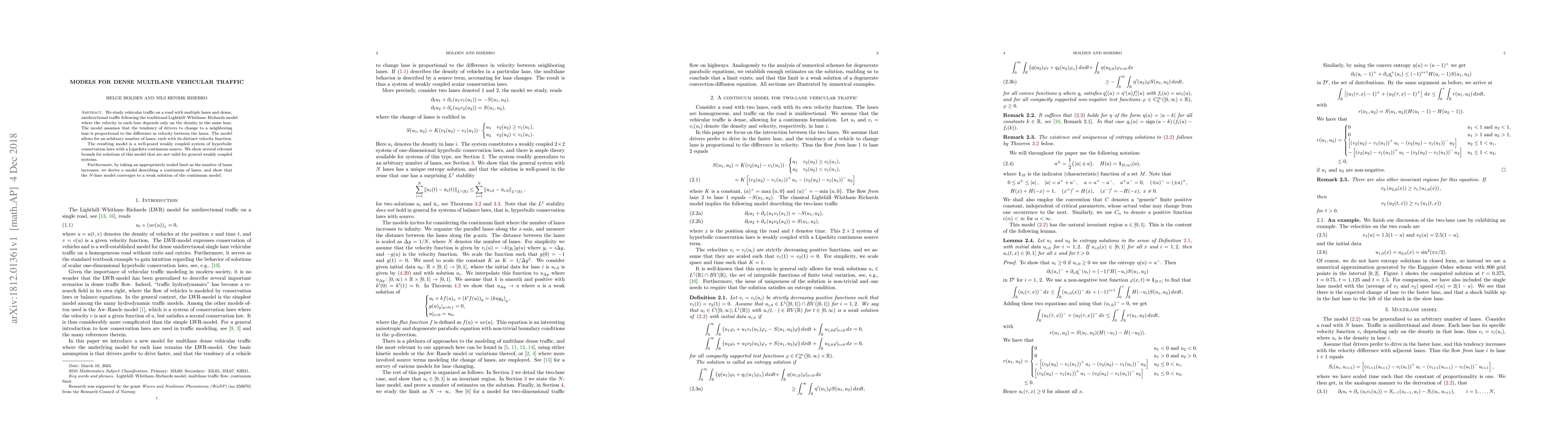 This paper develops a model for dense multilane vehicular traffic based on the Lighthill-Whitham-Richards framework, where lane changes are driven by velocity differences between lanes. It demonstrates the model's mathematical properties and shows convergence to a continuum model as the number of lanes increases.