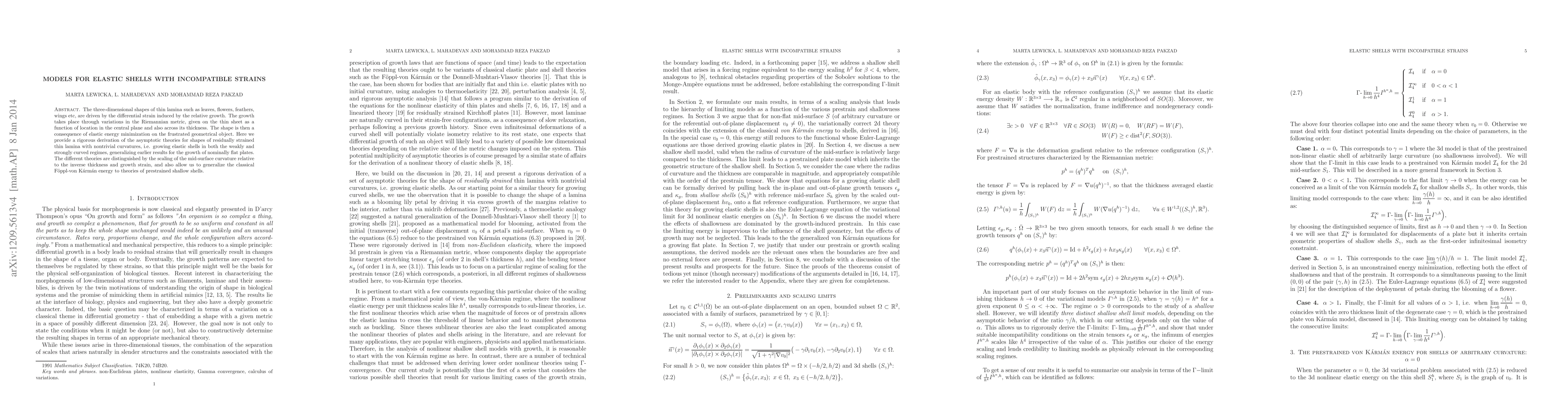 This paper rigorously derives asymptotic theories for elastic shells with incompatible strains, focusing on thin lamina like leaves and feathers. It generalizes earlier models for flat plates to include shells with nontrivial curvatures, distinguishing between weakly and strongly curved regimes.