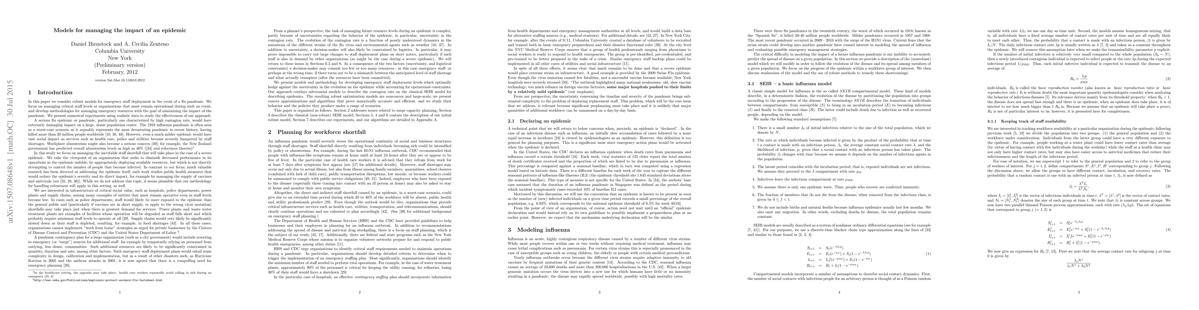 In this paper we consider robust models for emergency staff deployment in the event of a flu pandemic. We focus on managing critical staff levels at organizations that must remain operational during such an event, and develop methodologies for managing emergency resources with the goal of minimizing the impact of the pandemic. We present numerical experiments using realistic data to study the effectiveness of our approach. The underlying methodology is that of robust optimization; we model the problem as an infinite linear program which is approximately solved using a variant of Benders decomposition.
