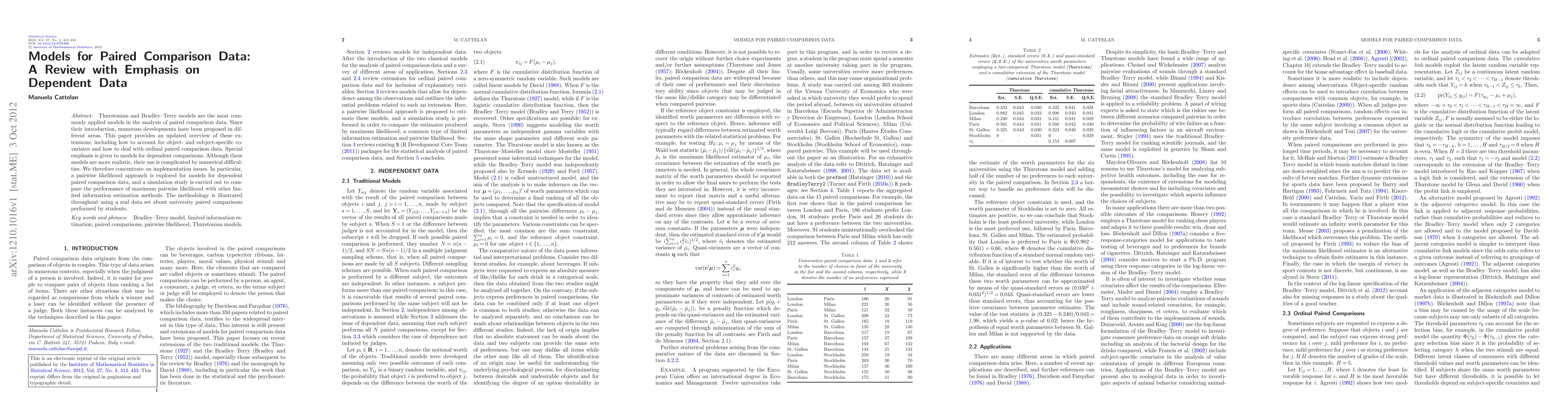This paper reviews and updates models for paired comparison data, focusing on handling dependent comparisons and implementing methods to overcome numerical difficulties. It explores a pairwise likelihood approach and compares its performance with other estimation methods through a simulation study.
