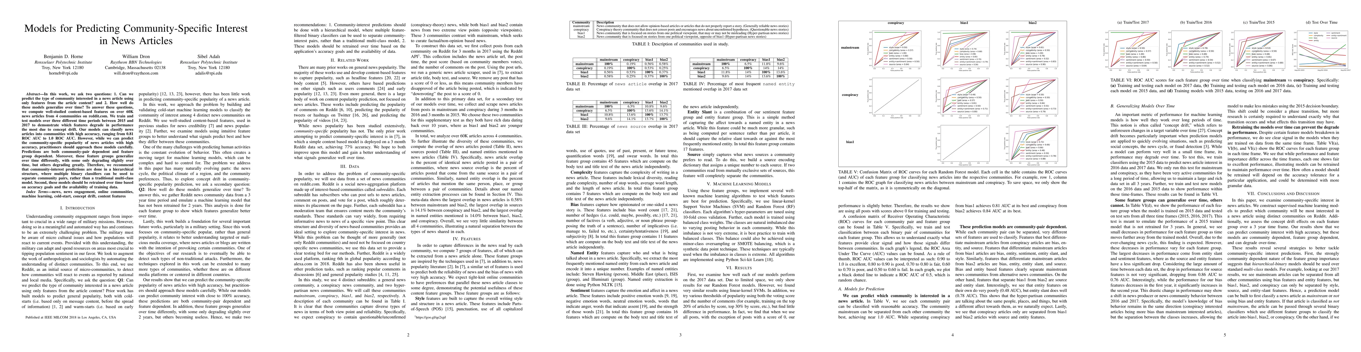 In this work, we ask two questions: 1. Can we predict the type of community interested in a news article using only features from the article content? and 2. How well do these models generalize over time? To answer these questions, we compute well-studied content-based features on over 60K news articles from 4 communities on reddit.com. We train and test models over three different time periods between 2015 and 2017 to demonstrate which features degrade in performance the most due to concept drift. Our models can classify news articles into communities with high accuracy, ranging from 0.81 ROC AUC to 1.0 ROC AUC. However, while we can predict the community-specific popularity of news articles with high accuracy, practitioners should approach these models carefully. Predictions are both community-pair dependent and feature group dependent. Moreover, these feature groups generalize over time differently, with some only degrading slightly over time, but others degrading greatly. Therefore, we recommend that community-interest predictions are done in a hierarchical structure, where multiple binary classifiers can be used to separate community pairs, rather than a traditional multi-class model. Second, these models should be retrained over time based on accuracy goals and the availability of training data.