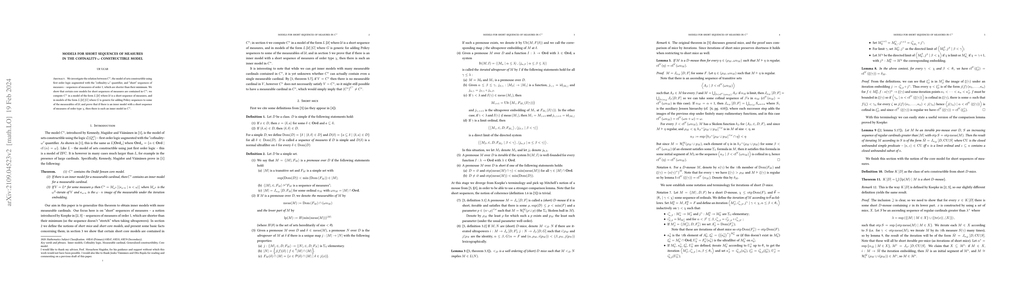 This paper explores the relationship between $C^{*}$, a model constructed using first-order logic with a "cofinality-$\omega$" quantifier, and short sequences of measures. It demonstrates that certain core models for these sequences are contained within $C^{*}$ and computes $C^{*}$ in specific models involving short sequences of measures and Prikry forcing.