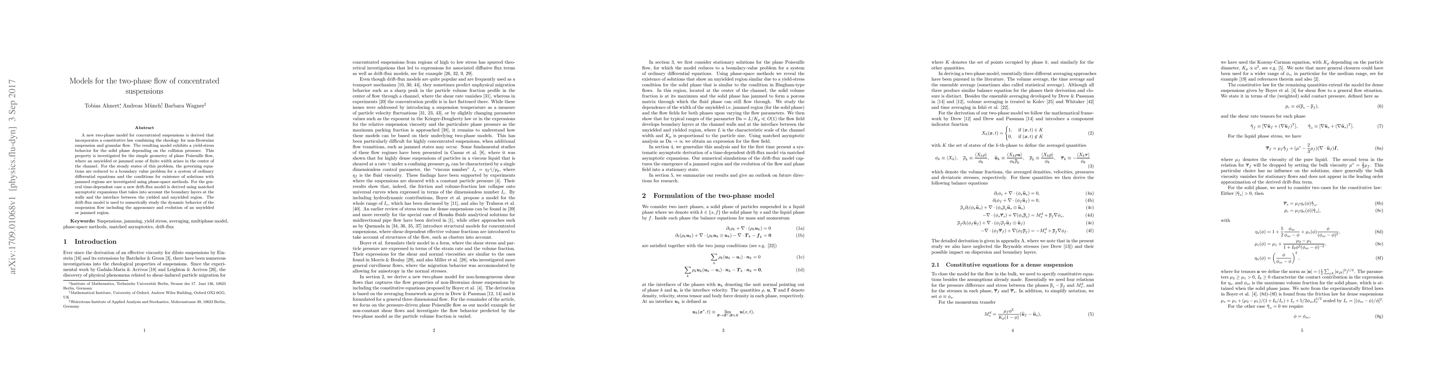 A new model for two-phase flow of concentrated suspensions was developed, showing yield-stress behavior in solid phases under collision pressure, and a drift-flux model was derived to study dynamic behavior including jammed regions.