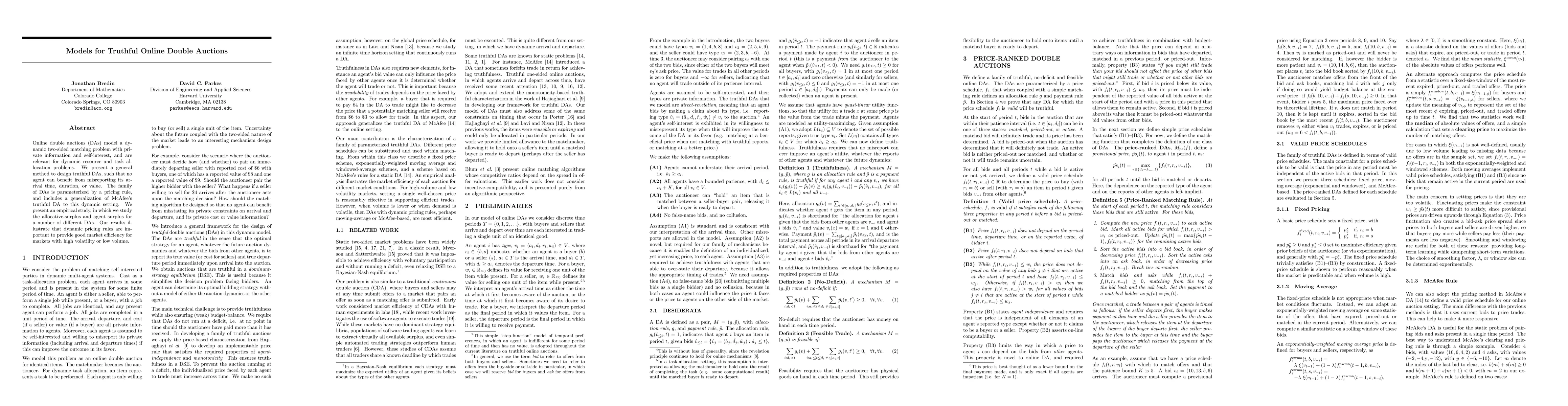 This paper proposes a general method for designing truthful online double auctions that prevent agents from benefiting from misreporting their attributes. It demonstrates the importance of dynamic pricing rules for achieving market efficiency, especially in volatile or low-volume markets, through an empirical study of allocative-surplus and agent surplus.