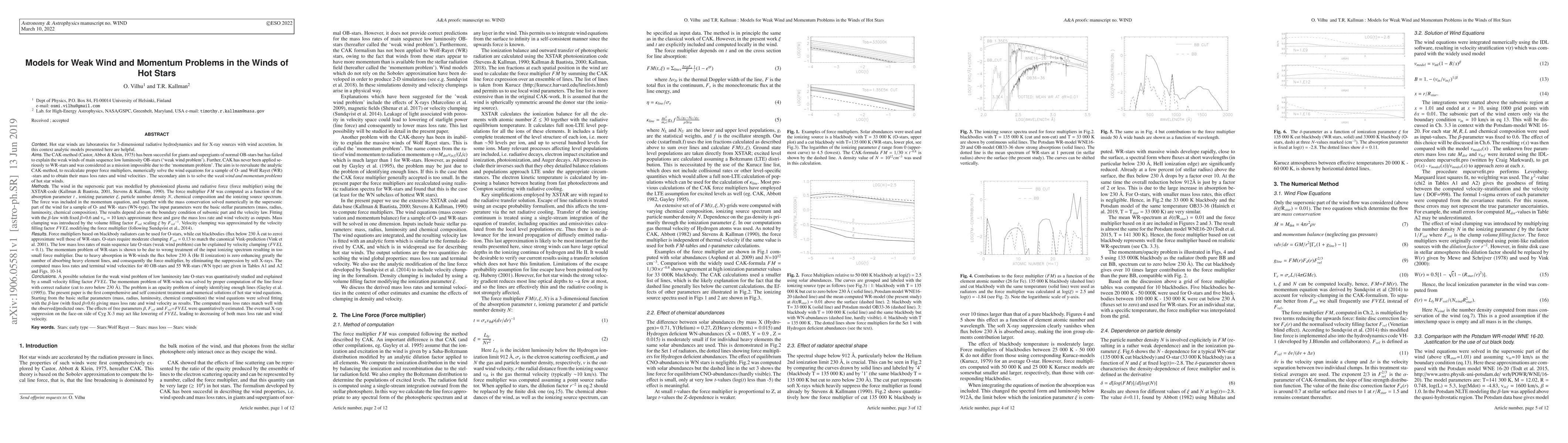 We pesent models for the velocity structure in the supersonic part of hot star winds in order to estimate the effects of clumping in density and velocity. XSTAR (Kallman,2018) was used to calculate radiation pressure in spectral lines (force multiplier FM) in Sobolev approximation (Castor et al., 1975 CAK; Stevens and Kallman, 1990). FM was computed as a function of two parameters: Xi and t. The line force was included in the momentum equation and mass conservation. These were integrated in the supersonic part of the wind for a sample of OB- and WR-stars. Fitting with the velocity-law gives mass loss rate and outflow velocity as outputs. The boundary condition of the subsonic part and the velocity law were approximated by using a beta-law formulation with beta = 0.6 and Vin = 10 km/s. It is found that WR-stars , owing to their large absorption, had already at r/Rstar = 1.01 radiation spectra lacking soft X-rays below 230 Angstroem (HeII ionization). This crucial fact enhances the force multiplier by a factor of 10, making it possible to accelerate their winds in the CAK-framework. Hence, the momentum problem is an opacity problem (Gayley et al. ,1995). Results for OB-stars point to a moderate density clumping (Fvol=0.13). In addition, main sequence OB-stars require velocity clumping (Fvel=0.1, Sundqvist et al 2014). This can explain the weak wind problem.