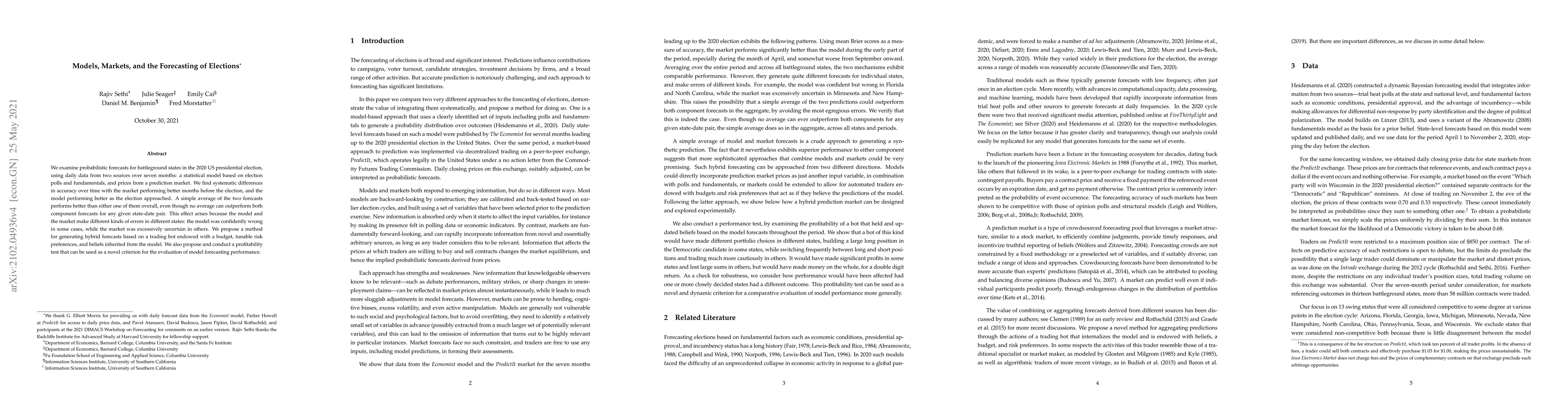 We examine probabilistic forecasts for battleground states in the 2020 US presidential election, using daily data from two sources over seven months: a model published by The Economist, and prices from the PredictIt exchange. We find systematic differences in accuracy over time, with markets performing better several months before the election, and the model performing better as the election approached. A simple average of the two forecasts performs better than either one of them overall, even though no average can outperform both component forecasts for any given state-date pair. This effect arises because the model and the market make different kinds of errors in different states: the model was confidently wrong in some cases, while the market was excessively uncertain in others. We conclude that there is value in using hybrid forecasting methods, and propose a market design that incorporates model forecasts via a trading bot to generate synthetic predictions. We also propose and conduct a profitability test that can be used as a novel criterion for the evaluation of forecasting performance.