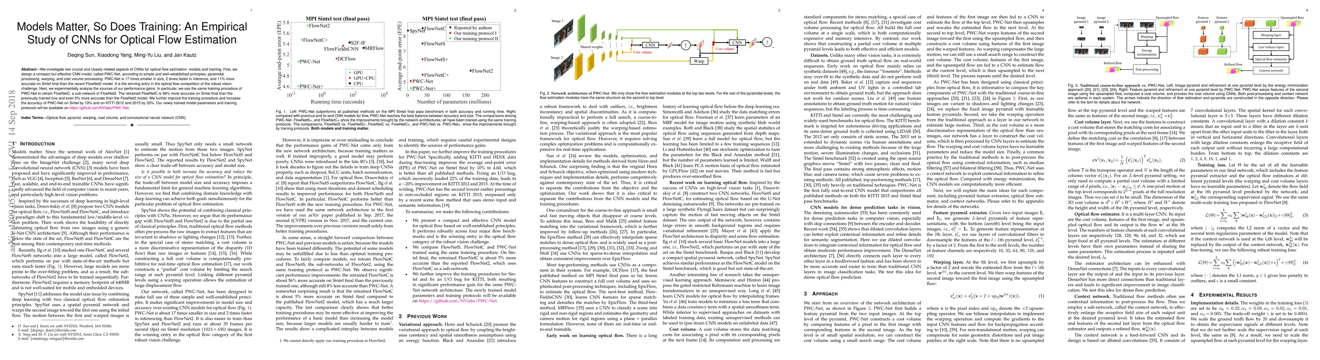 We investigate two crucial and closely related aspects of CNNs for optical flow estimation: models and training. First, we design a compact but effective CNN model, called PWC-Net, according to simple and well-established principles: pyramidal processing, warping, and cost volume processing. PWC-Net is 17 times smaller in size, 2 times faster in inference, and 11\% more accurate on Sintel final than the recent FlowNet2 model. It is the winning entry in the optical flow competition of the robust vision challenge. Next, we experimentally analyze the sources of our performance gains. In particular, we use the same training procedure of PWC-Net to retrain FlowNetC, a sub-network of FlowNet2. The retrained FlowNetC is 56\% more accurate on Sintel final than the previously trained one and even 5\% more accurate than the FlowNet2 model. We further improve the training procedure and increase the accuracy of PWC-Net on Sintel by 10\% and on KITTI 2012 and 2015 by 20\%. Our newly trained model parameters and training protocols will be available on https://github.com/NVlabs/PWC-Net