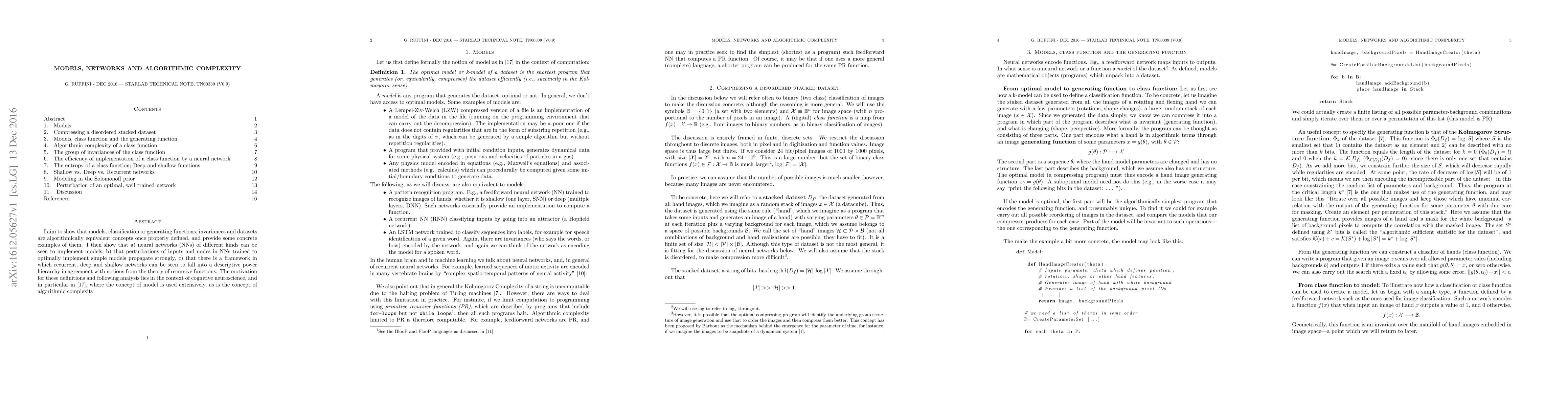 I aim to show that models, classification or generating functions, invariances and datasets are algorithmically equivalent concepts once properly defined, and provide some concrete examples of them. I then show that a) neural networks (NNs) of different kinds can be seen to implement models, b) that perturbations of inputs and nodes in NNs trained to optimally implement simple models propagate strongly, c) that there is a framework in which recurrent, deep and shallow networks can be seen to fall into a descriptive power hierarchy in agreement with notions from the theory of recursive functions. The motivation for these definitions and following analysis lies in the context of cognitive neuroscience, and in particular in Ruffini (2016), where the concept of model is used extensively, as is the concept of algorithmic complexity.