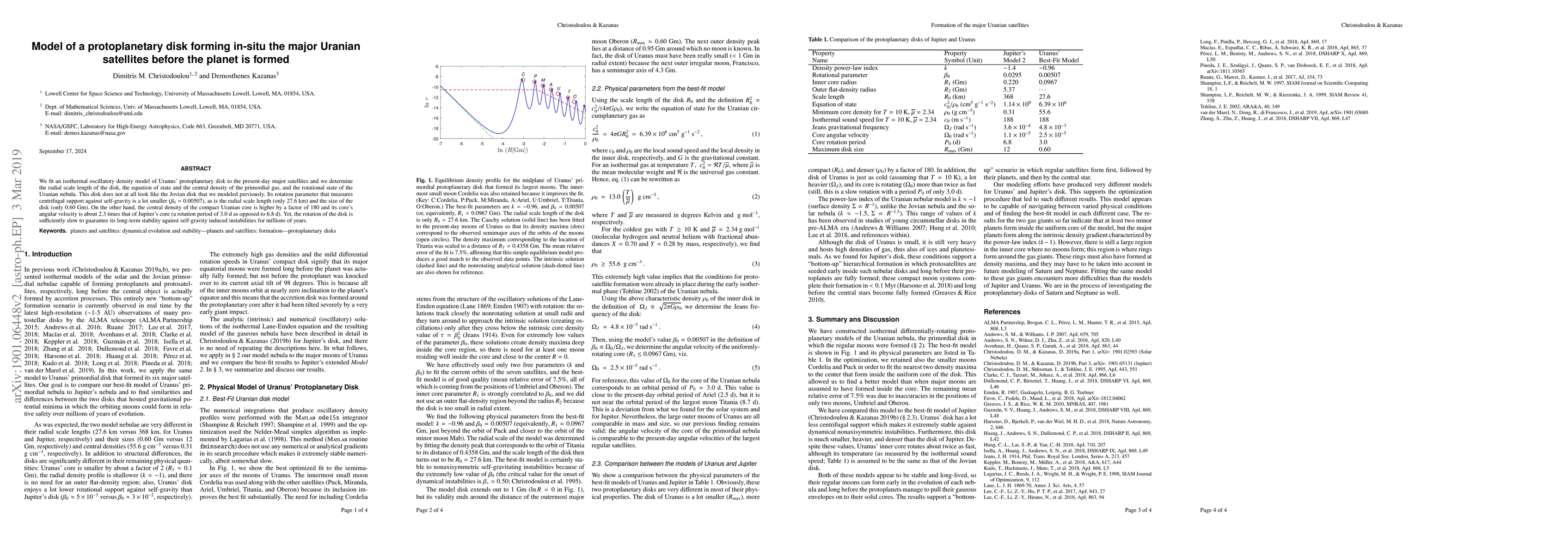 This study models the protoplanetary disk around Uranus, finding it significantly smaller and denser than Jupiter's disk, with a lower rotation parameter and a more compact, rapidly rotating Uranian core. The disk's slow rotation ensures long-term stability.