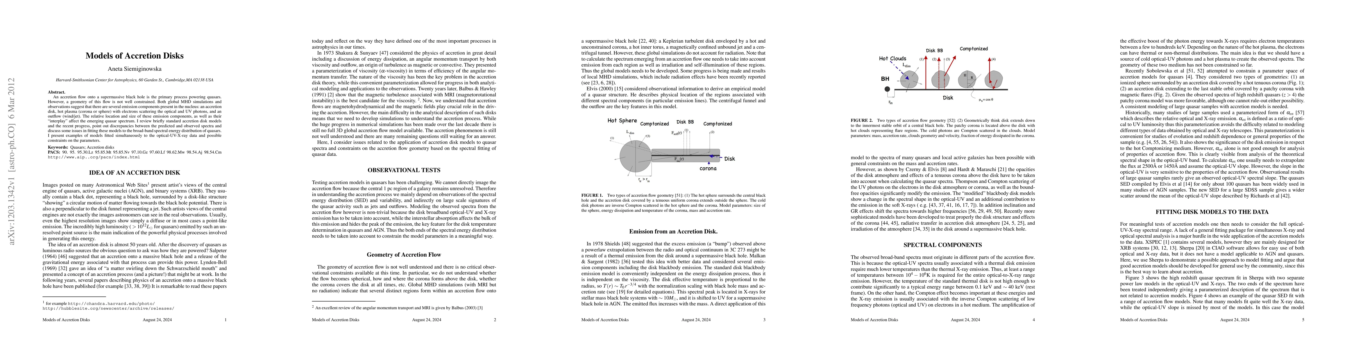 An accretion flow onto a supermassive black hole is the primary process powering quasars. However, a geometry of this flow is not well constrained. Both global MHD simulations and observations suggest that there are several emission components present in the nucleus: an accretion disk, hot plasma (corona or sphere) with electrons scattering the optical and UV photons, and an outflow (wind/jet). The relative location and size of these emission components, as well as their "interplay" affect the emerging quasar spectrum. I review briefly standard accretion disk models and the recent progress, point out discrepancies between the predicted and observed spectra and discuss some issues in fitting these models to the broad-band spectral energy distribution of quasars. I present examples of models fitted simultaneously to the optical-UV-X-ray data and possible constraints on the parameters.