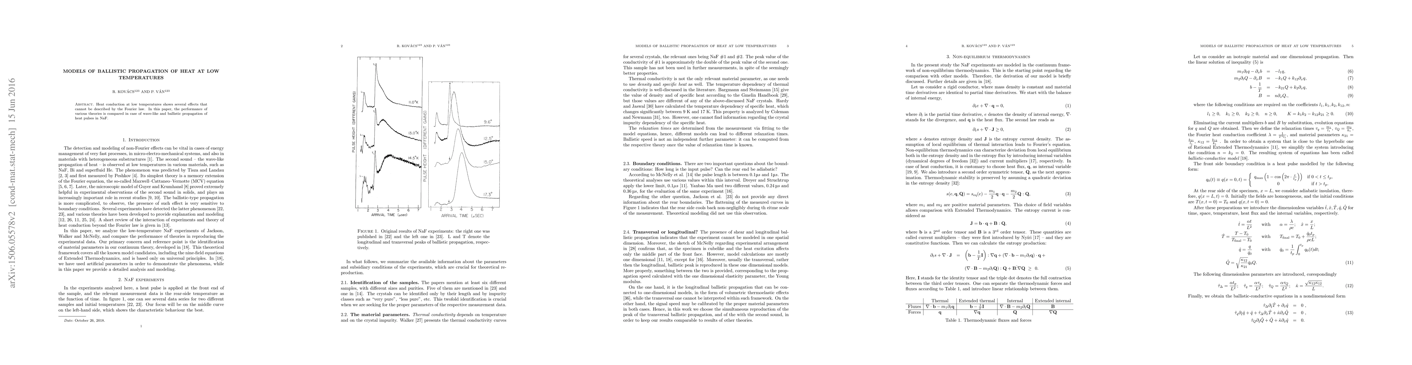 This paper examines the performance of different models for heat conduction at low temperatures, focusing on ballistic propagation phenomena in NaF, comparing their effectiveness in describing effects like second sound and wave-like heat pulses.