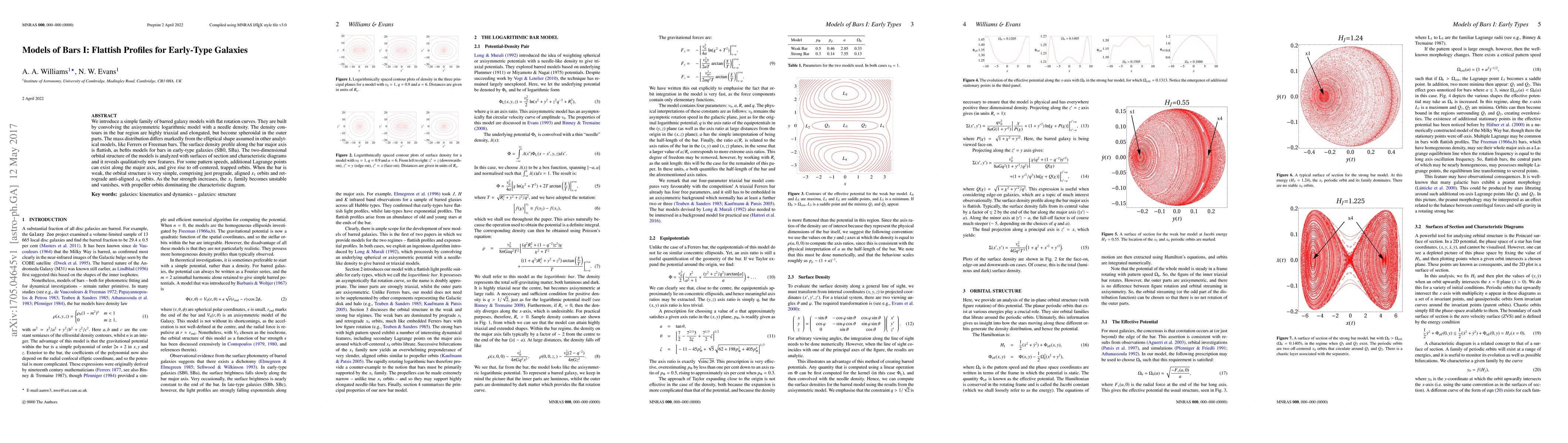 We introduce a simple family of barred galaxy models with flat rotation curves. They are built by convolving the axisymmetric logarithmic model with a needle density. The density contours in the bar region are highly triaxial and elongated, but become spheroidal in the outer parts. The mass distribution differs markedly from the elliptical shape assumed in other analytical models, like Ferrers or Freeman bars. The surface density profile along the bar major axis is flattish, as befits models for bars in early-type galaxies (SB0, SBa). The two-dimensional orbital structure of the models is analysed with surfaces of section and characteristic diagrams and it reveals qualitatively new features. For some pattern speeds, additional Lagrange points can exist along the major axis, and give rise to off-centered, trapped orbits. When the bar is weak, the orbital structure is very simple, comprising just prograde, aligned $x_1$ orbits and retrograde anti-aligned $x_4$ orbits. As the bar strength increases, the $x_1$ family becomes unstable and vanishes, with propeller orbits dominating the characteristic diagram.