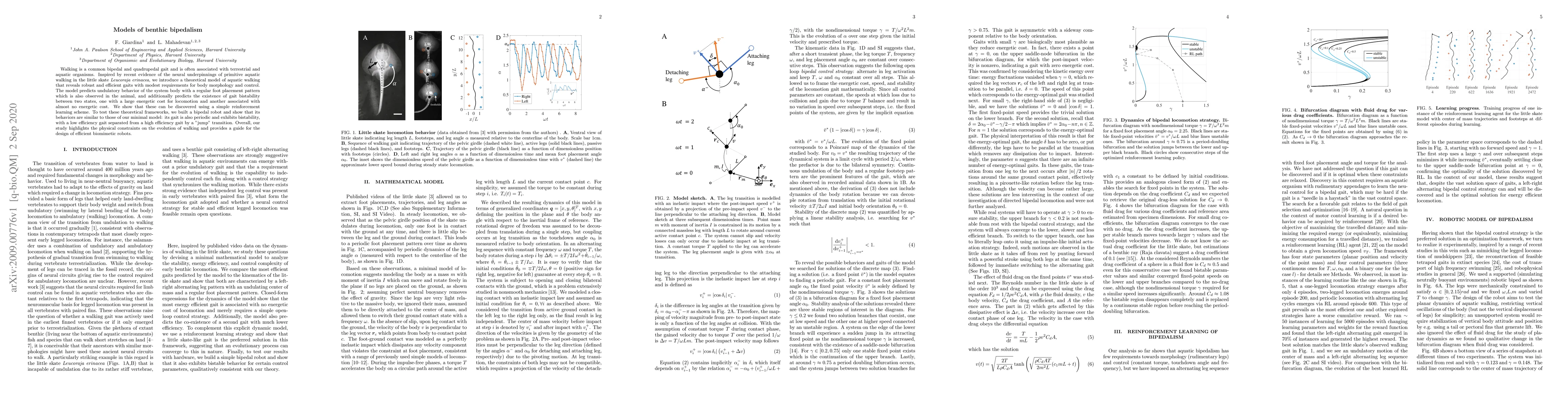 Walking is a common bipedal and quadrupedal gait and is often associated with terrestrial and aquatic organisms. Inspired by recent evidence of the neural underpinnings of primitive aquatic walking in the little skate Leucoraja erinacea, we introduce a theoretical model of aquatic walking that reveals robust and efficient gaits with modest requirements for body morphology and control. The model predicts undulatory behavior of the system body with a regular foot placement pattern which is also observed in the animal, and additionally predicts the existence of gait bistability between two states, one with a large energetic cost for locomotion and another associated with almost no energetic cost. We show that these can be discovered using a simple reinforcement learning scheme. To test these theoretical frameworks, we built a bipedal robot and show that its behaviors are similar to those of our minimal model: its gait is also periodic and exhibits bistability, with a low efficiency gait separated from a high efficiency gait by a "jump" transition. Overall, our study highlights the physical constraints on the evolution of walking and provides a guide for the design of efficient biomimetic robots.