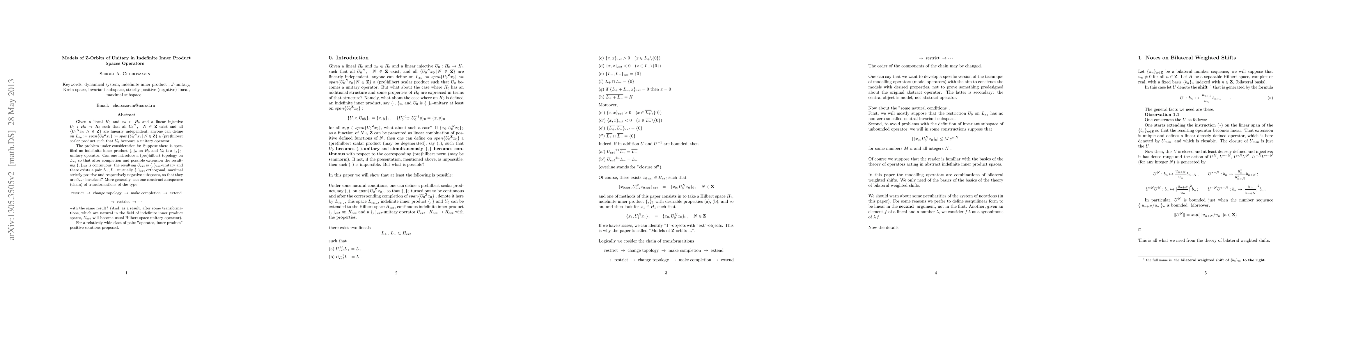 Given a lineal H_0 and x_0\in H_0 and a linear injective operator U_0: H_0 \to H_0 such that all U_0^N, N \in {\bf Z} exist and all U_0^N x_0, N \in {\bf Z} are linearly independent, anyone can define on span{{U_0}^N x_0 | N \in {\bf Z}} a (pre)hilbert scalar product such that U_0 becomes a unitary operator. The problem under consideration is: Suppose there is specified an indefinite inner product {,}_0 on H_0 and U_0 is a {,}_0-unitary operator. Can one introduce a (pre)hilbert topology on L_{x_0} so that after completion and possible extension the resulting {,}_ext is continuous, the resulting U_ext is {,}_ext-unitary and there exists a pair L_{+}, L_{-} mutually {,}_ext-orthogonal, maximal strictly positive and respectively negative subspaces, so that they are U_ext-invariant? More generally, can one construct a sequence (chain) of transformations of the type "restrict, change topology, make completion, extend, restrict,..." with the same result? (And, as a result, after some transformations, which are natural in the field of indefinite inner product spaces, U_ext will become usual Hilbert space unitary operator). For a relatively wide class of pairs "operator, inner product" positive solutions proposed.