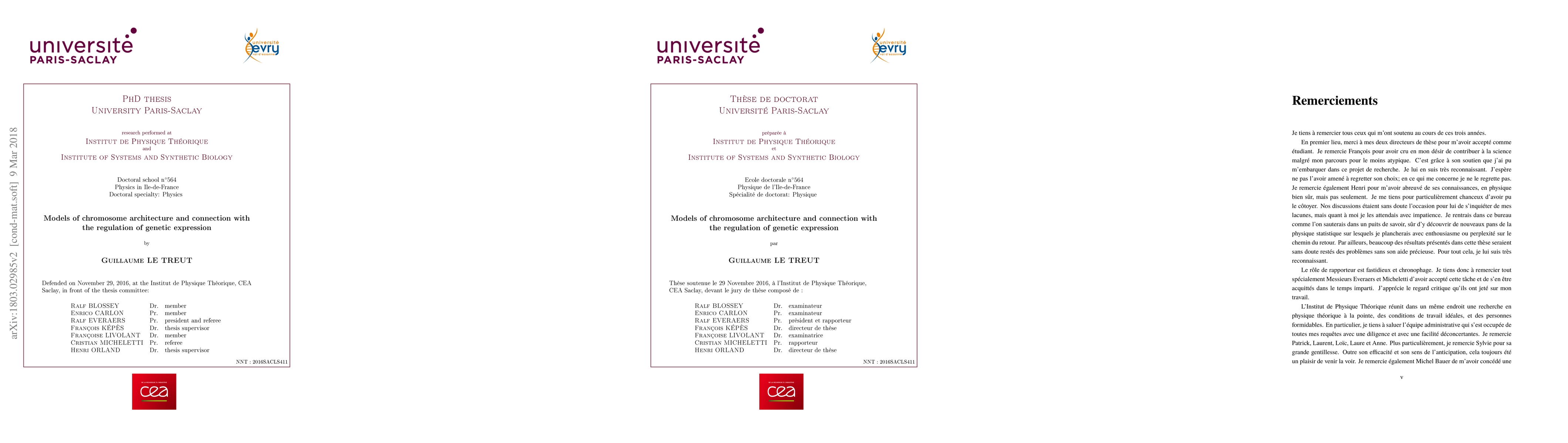Increasing evidence suggests that chromosome folding and genetic expression are intimately connected. For example, the co-expression of a large number of genes can benefit from their spatial co-localization in the cellular space. Furthermore, functional structures can result from the particular folding of the chromosome. Such phenomena have in common to result from the binding of divalent proteins that can bridge regions sometimes far away on the DNA sequence. The physical system consisting of the chromosome interacting with divalent proteins can be very complex. As such, most of the mechanisms responsible for chromosome folding and for the formation of functional structures have remained elusive. Using methods from statistical physics, we investigated models of chromosome architecture. A common denominator of our approach has been to represent the chromosome as a polymer with bending rigidity and consider its interaction with a solution of DNA-binding proteins. Structures entailed by the binding of such proteins were then characterized at the thermodynamical equilibrium. Furthermore, we complemented theoretical results with Brownian dynamics simulations, allowing to reproduce more of the biological complexity. The main contributions of this thesis have been: (i) to provide a model for the existence of transcription factories characterized in vivo with fluorescence microscopy; (ii) to propose a physical basis for a conjectured regulatory mechanism of the transcription involving the formation of DNA hairpin loops by the H-NS protein as characterized with atomic-force microscopy experiments; (iii) to propose a physical model of the chromosome that reproduces contacts measured in chromosome conformation capture (CCC) experiments. Consequences on the regulation of transcription are discussed in each of these studies.