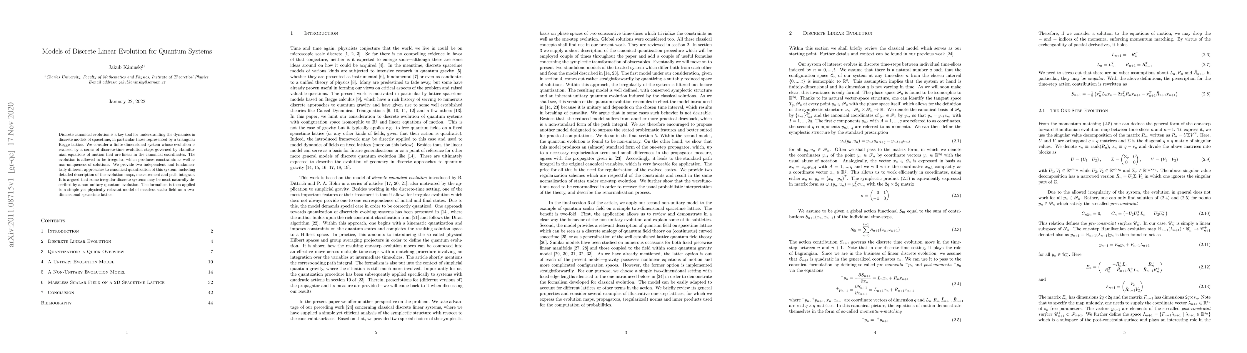 Researchers develop two approaches to quantizing discrete linear evolution models for quantum systems, exploring the potential for non-unitary quantum evolutions and applying the formalism to a simple massless scalar field model.