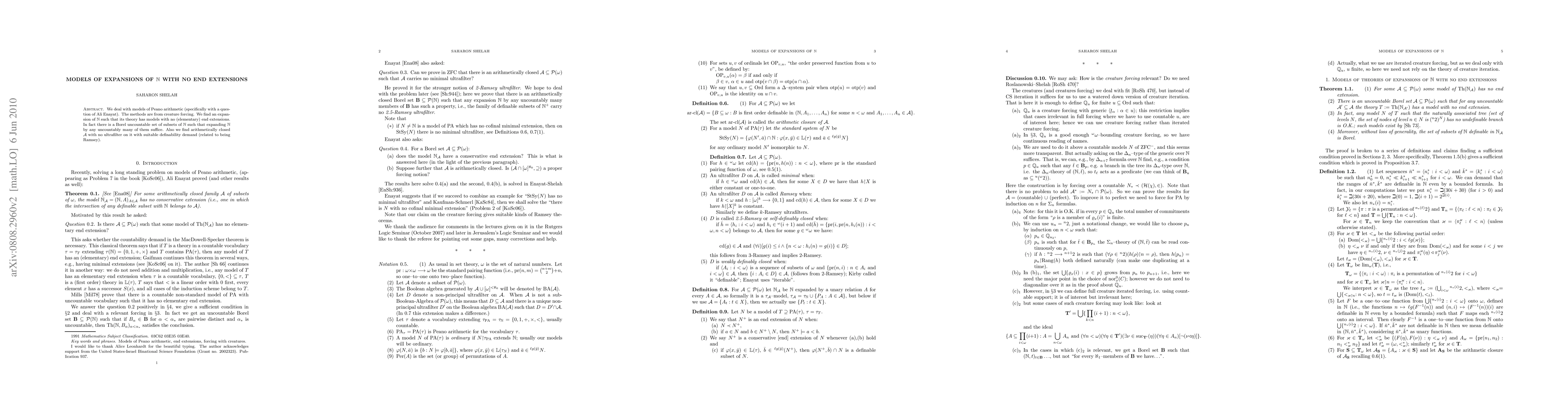 We deal with models of Peano arithmetic (specifically with a question of Ali Enayat). The methods are from creature forcing. We find an expansion of N such that its theory has models with no (elementary) end extensions. In fact there is a Borel uncountable set of subsets of N such that expanding N by any uncountably many of them suffice. Also we find arithmetically closed A with no definably closed ultrafilter on it.