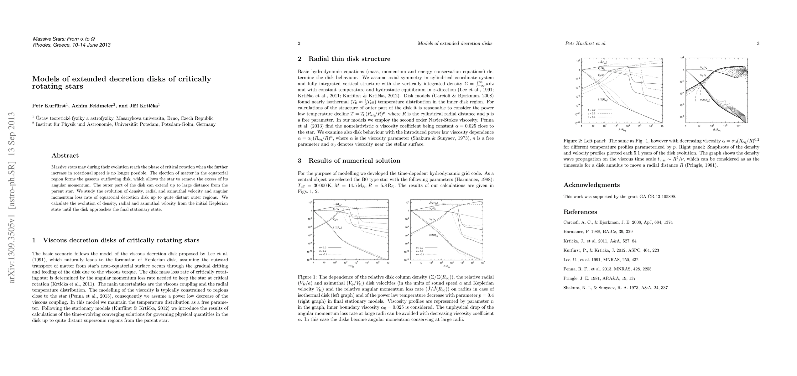 This paper investigates the formation and evolution of decretion disks around critically rotating massive stars, focusing on density, radial and azimuthal velocities, and angular momentum loss in the extended outflowing disk. The study models the transition from initial Keplerian motion to a final stationary state in the disk's outer regions.