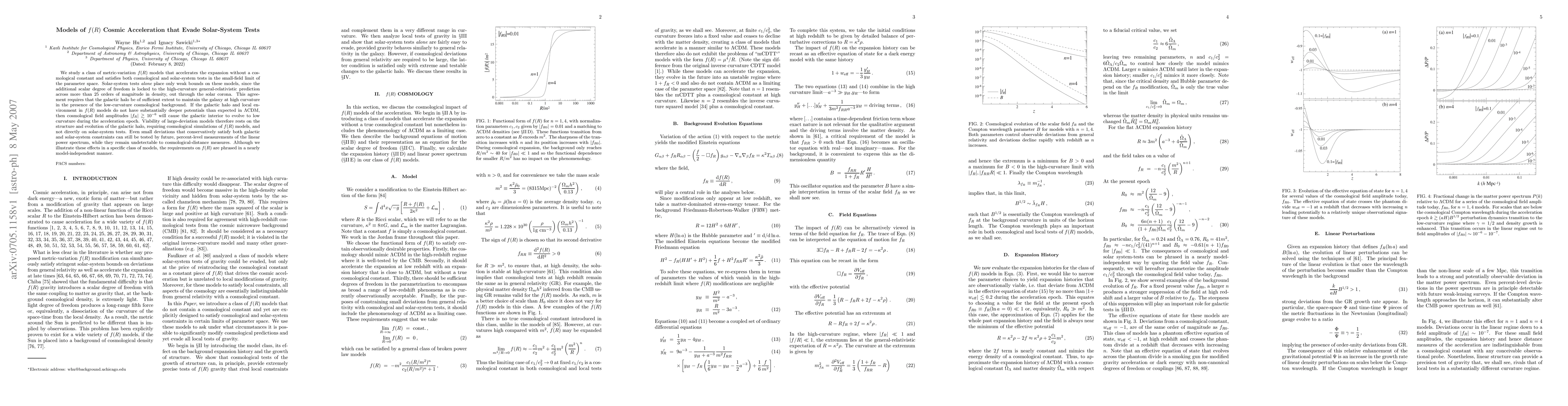 We study a class of metric-variation f(R) models that accelerates the expansion without a cosmological constant and satisfies both cosmological and solar-system tests in the small-field limit of the parameter space. Solar-system tests alone place only weak bounds on these models, since the additional scalar degree of freedom is locked to the high-curvature general-relativistic prediction across more than 25 orders of magnitude in density, out through the solar corona. This agreement requires that the galactic halo be of sufficient extent to maintain the galaxy at high curvature in the presence of the low-curvature cosmological background. If the galactic halo and local environment in f(R) models do not have substantially deeper potentials than expected in LCDM, then cosmological field amplitudes |f_R| > 10^{-6} will cause the galactic interior to evolve to low curvature during the acceleration epoch. Viability of large-deviation models therefore rests on the structure and evolution of the galactic halo, requiring cosmological simulations of f(R) models, and not directly on solar-system tests. Even small deviations that conservatively satisfy both galactic and solar-system constraints can still be tested by future, percent-level measurements of the linear power spectrum, while they remain undetectable to cosmological-distance measures. Although we illustrate these effects in a specific class of models, the requirements on f(R) are phrased in a nearly model-independent manner.