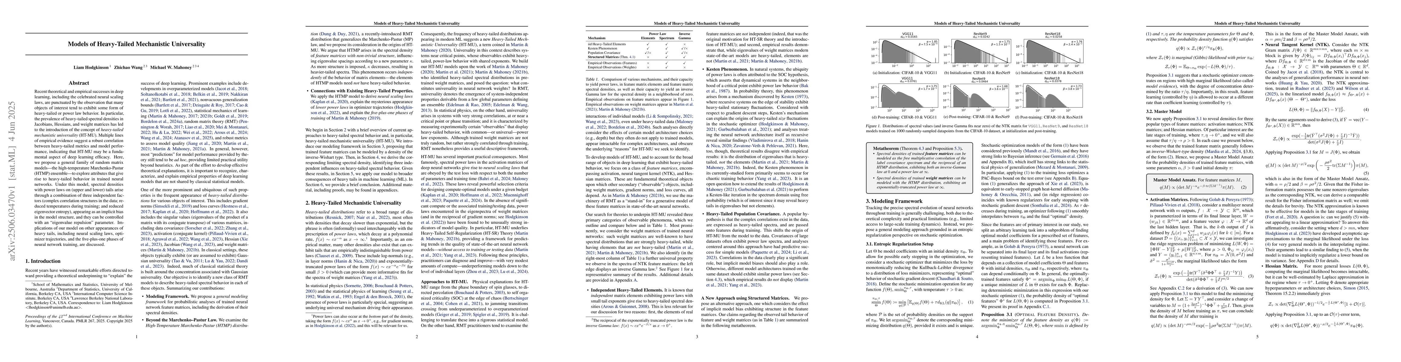 Recent theoretical and empirical successes in deep learning, including the celebrated neural scaling laws, are punctuated by the observation that many objects of interest tend to exhibit some form of heavy-tailed or power law behavior. In particular, the prevalence of heavy-tailed spectral densities in Jacobians, Hessians, and weight matrices has led to the introduction of the concept of heavy-tailed mechanistic universality (HT-MU). Multiple lines of empirical evidence suggest a robust correlation between heavy-tailed metrics and model performance, indicating that HT-MU may be a fundamental aspect of deep learning efficacy. Here, we propose a general family of random matrix models -- the high-temperature Marchenko-Pastur (HTMP) ensemble -- to explore attributes that give rise to heavy-tailed behavior in trained neural networks. Under this model, spectral densities with power laws on (upper and lower) tails arise through a combination of three independent factors (complex correlation structures in the data; reduced temperatures during training; and reduced eigenvector entropy), appearing as an implicit bias in the model structure, and they can be controlled with an "eigenvalue repulsion" parameter. Implications of our model on other appearances of heavy tails, including neural scaling laws, optimizer trajectories, and the five-plus-one phases of neural network training, are discussed.