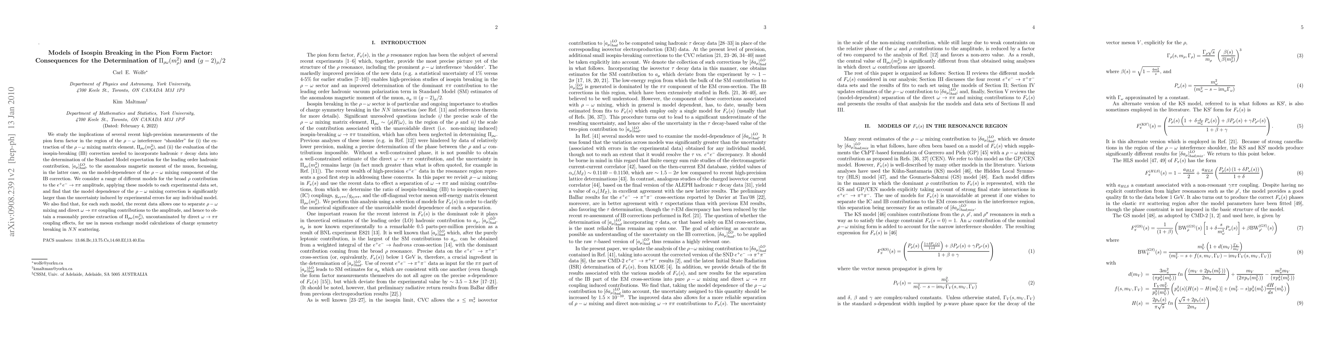 We study the implications of several recent high-precision measurements of the pion form factor in the region of the rho-omega interference "shoulder" for (i) the extraction of the rho-omega mixing matrix element, Pi_{\rho\omega}(m_rho^2), and (ii) the evaluation of the isospin-breaking (IB) correction needed to incorporate hadronic tau decay data into the determination of the Standard Model expectation for the leading order hadronic contribution, [a_mu]_{had}^{LO}, to the anomalous magnetic moment of the muon, focussing, in the latter case, on the model-dependence of the rho-omega mixing component of the IB correction. We consider a range of different models for the broad rho contribution to the e^+e^- --> \pi\pi amplitude, applying these models to each experimental data set, and find that the model dependence of the rho-omega mixing correction is significantly larger than the uncertainty induced by experimental errors for any individual model. We also find that, for each such model, the recent data allows one to separate rho-omega mixing and direct omega --> \pi\pi coupling contributions to the amplitude, and hence to obtain a reasonably precise extraction of Pi_{\rho\omega}(m_rho^2), uncontaminated by direct omega --> \pi\pi coupling effects, for use in meson exchange model calculations of charge symmetry breaking in NN scattering.